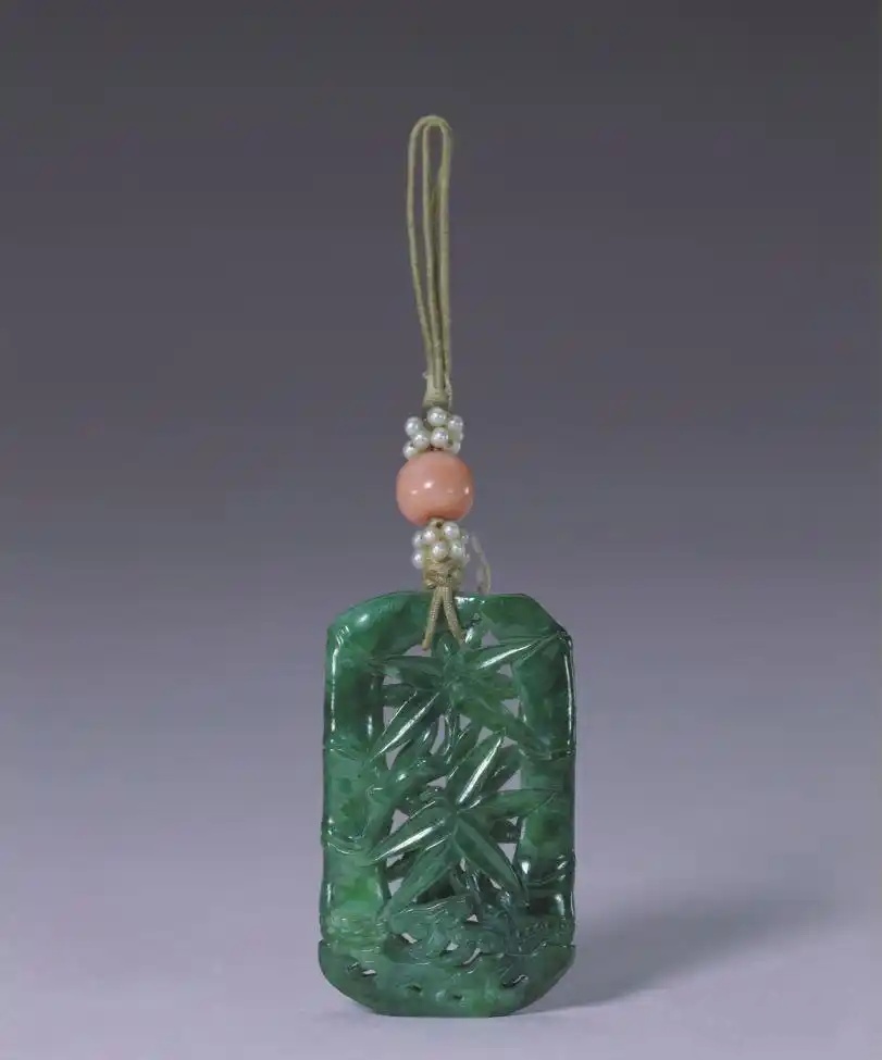 佩翠质绿色,局部色较深。佩为长方形,以竹枝为边框,底部镂雕成山石,上有灵芝,中部镂雕出竹叶及竹枝。此佩之翠色与竹之天然色泽较为接近,作者以竹为题材,体现出设计的精妙。佩上部系黄丝绳,上有珊瑚结珠,两端各有米珠一组。