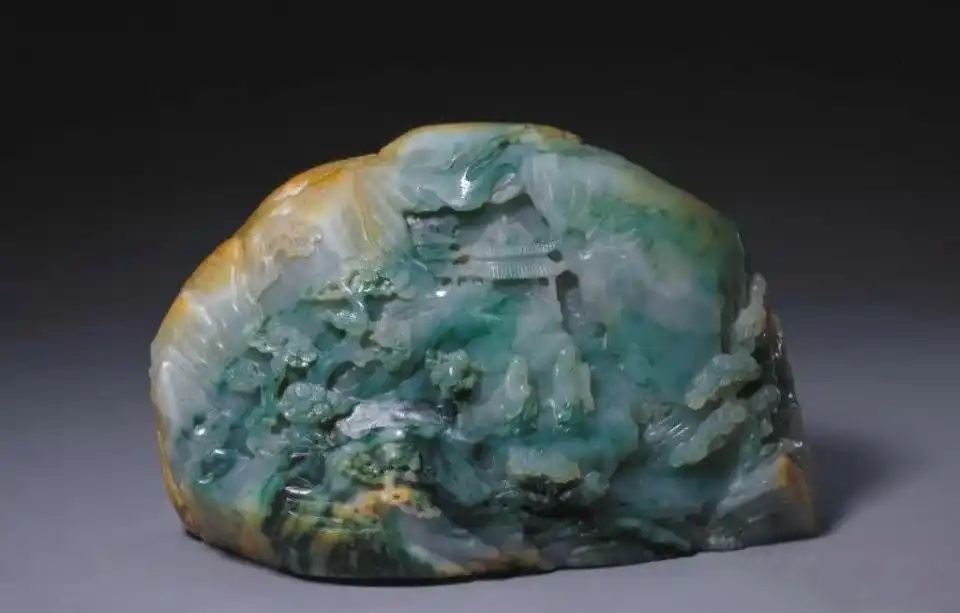 此器既有玉皮的黄色,又在翠绿中含有白色,绿白分明,黄绿相间,色彩鲜艳。全器构图合理,景物比例适当,透视感强,是非常珍贵的山形陈设品。
