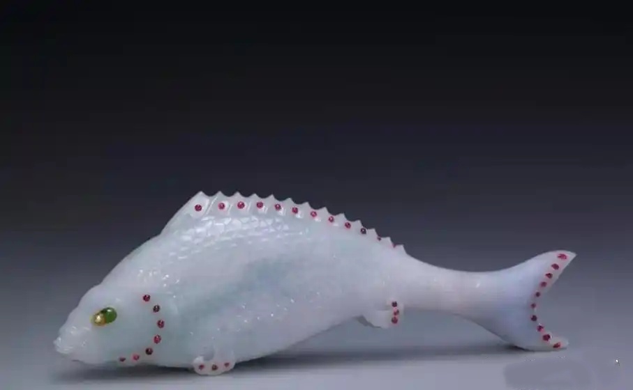 翠色青绿。盒为鱼形,两半相扣成盒。鱼身有细鳞纹,鳍、尾、鳃部嵌有红宝石。盒内刻有乾隆御制诗《咏痕都斯坦玉鱼》。