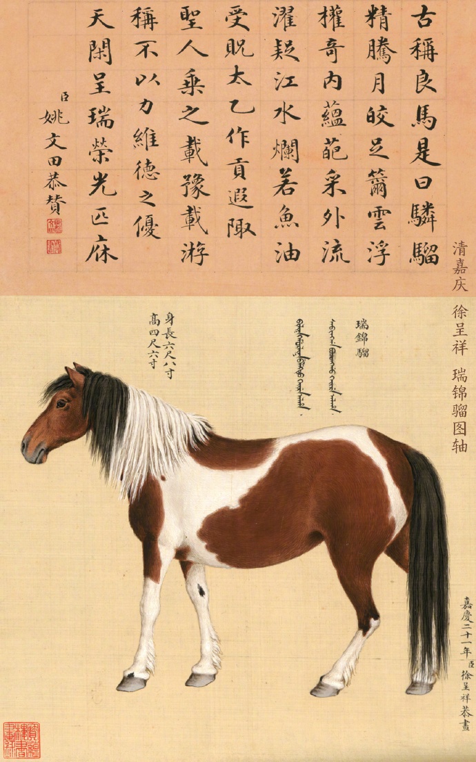 清嘉庆,徐呈祥,瑞锦骝图轴。清代,以蒙古族为代表的少数民族屡次向清皇室进献优良马匹,其中以在乾隆朝所献数量最多,其余各朝亦偶有进献。嘉庆二十一年(1816),嘉庆帝效仿乾隆帝之举,特命宫廷御用画师徐呈祥将蒙古族首领进献之马绘于绢上,以资纪念。该马通体皮毛为棕白色相间,身长六尺八寸,身高四尺六寸,其颈背鬃毛黑白交织如云锦,四蹄健硕若踣铁,展现出典型的蒙古马种特征。图中的马虽未采用郎世宁作品中的西洋透视技法,但通过劲健的用笔与细腻的设色,成功塑造出其雄健的仪态,堪称清代中期宫廷鞍马画的典范之作。