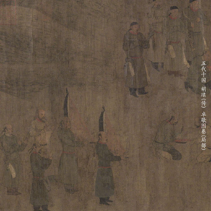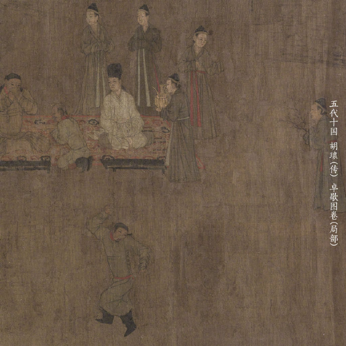 “卓歇”即为停车立帐、休整小憩之意。这幅画作旧传为五代契丹画家胡瓌所绘,据画中人物的外形特点,极可能出自金代汉族画家的手笔。画卷中表现的,是女真贵族在狩猎歇息时,邀南宋使臣宴饮观舞的情景。马背上的猎物,点出人与马刚从追逐喧闹中转入静态;马群的尽头,是走向乐舞场地的捧花女;舞蹈者在箜篌的伴奏下跳跃,构成全图的高潮。