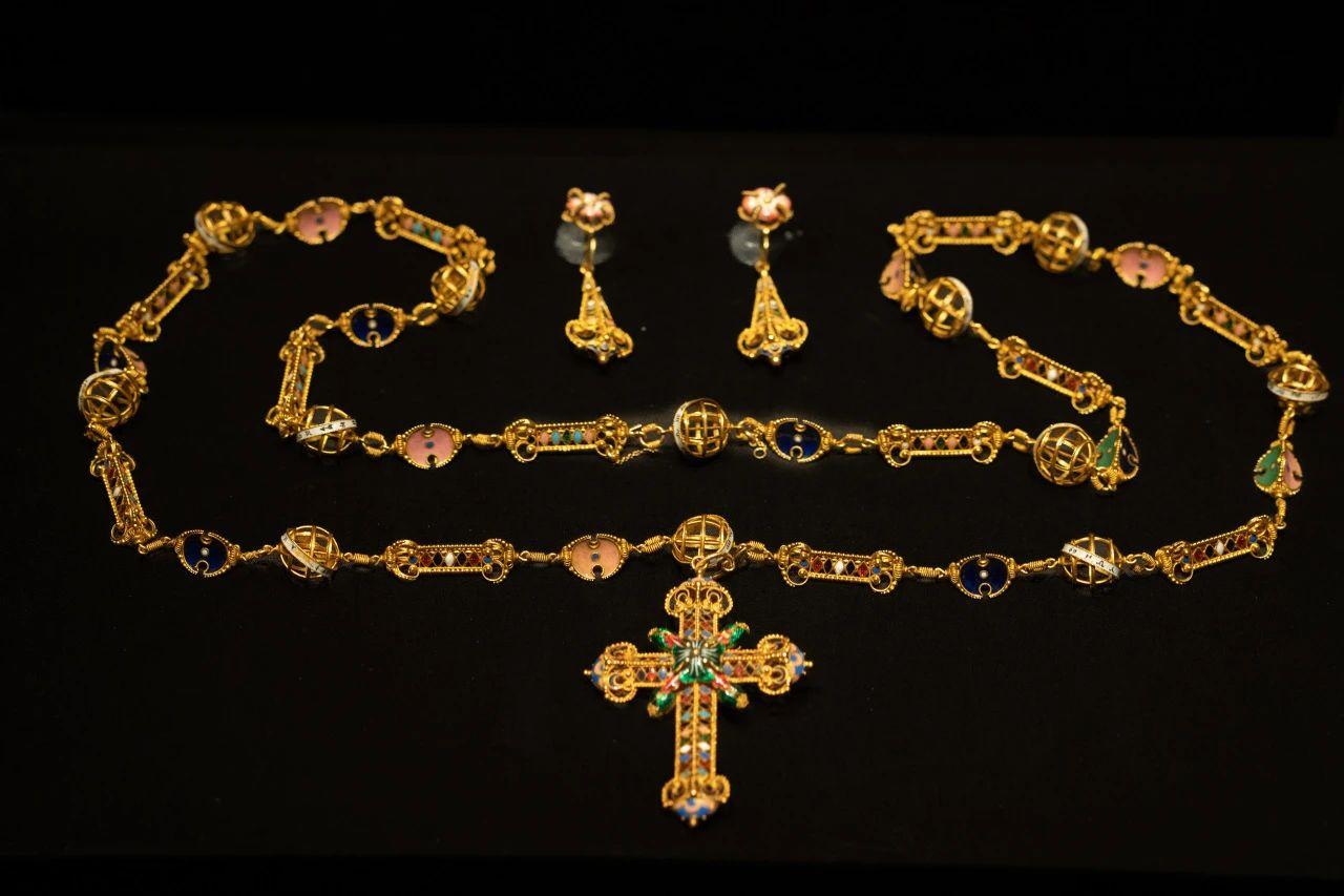 拿破仑战争后,欧洲人急切想要摆脱过去的阴影,拥抱生活的快乐,于是珠宝开始变得绚烂多彩,珐琅被大量使用。展览中这套黄金珐琅珠宝套装即制作于这个时期,鲜艳的红色、绿色与白色纵横交织,代表“信、望、爱”,而项链上的镂空金球以天文学中的仪器为原型,珐琅上则细密地绘有12星座符号。