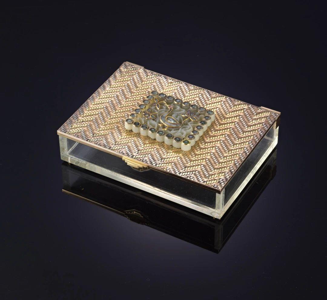 19世纪中后期的两次工业革命,促使机械大生产逐步取代手工技术的生产方式,为珠宝行业带来了更高的产能与性价比更高的材料,如玻璃、合金,这些新材料使得艺术家和设计师在装饰艺术方面获得了创作的灵感和无限的潜在可能性。展出的这件化妆盒,长方形盒身为透明有机玻璃,盒盖装饰金银合金编织纹,中心镶嵌白玉雕件及各色宝石。有机玻璃实现了宝石和金属所不具备的透明通透,为饰物带来了全新的视觉观感。