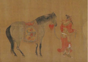 元,佚名,职贡图卷。本图绘吐蕃、回鹘等使臣身着本民族服饰,向元皇室呈献良马的场景。画面中,宝马依次排列,皆膘肥体壮、鬃毛飞扬,尽显异域良驹之独特神韵。每匹骏马均配以精巧华美的鞍鞯,令马儿更显得神气高贵。向元皇室敬献宝马之举,实乃投帝王所好。元朝皇帝是草原民族出身,对马匹怀有天然的亲近感,在元朝政权建立过程中,马匹对提升军队机动性、战斗力曾起着决定性作用。因此元朝历代皇室酷爱良马,不惜重金广求天下名驹。宫廷特设太仆寺以专司全国马政,元世祖忽必烈更将牧马之地拓展至漠南,精心培育蒙古马、西域汗血马等珍稀品种。据《元史》所载,皇家马厩常蓄良马十余万匹,其中西域诸国进贡之“天马”,更被视为祥瑞之兆。