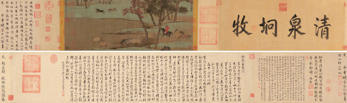 元,赵孟頫,秋郊饮马图卷。此图卷堪称赵孟頫的代表作。画面描绘了秋初时节郊外的景象,牧马人骑在马上,手持马鞭,正督促着马儿到池畔饮水。画面中的马均未配鞍座,它们各个肌肉发达、线条流畅,四肢修长而蹄子宽阔。这些马儿姿态各异,有的相互追逐打闹,活力四射 ;有的则悠然自得地缓步前行,尽显闲适 ;还有的俯首饮水,将无拘无束的自然天趣展现得淋漓尽致。牧马人身着红色衣袍,从其装扮和姿态推测,应该是位管理官府马匹的圉官。本图卷曾被清乾隆帝珍藏,他在引首处题“清泉坰牧”四字,以此赞美景致宜人的牧放环境。