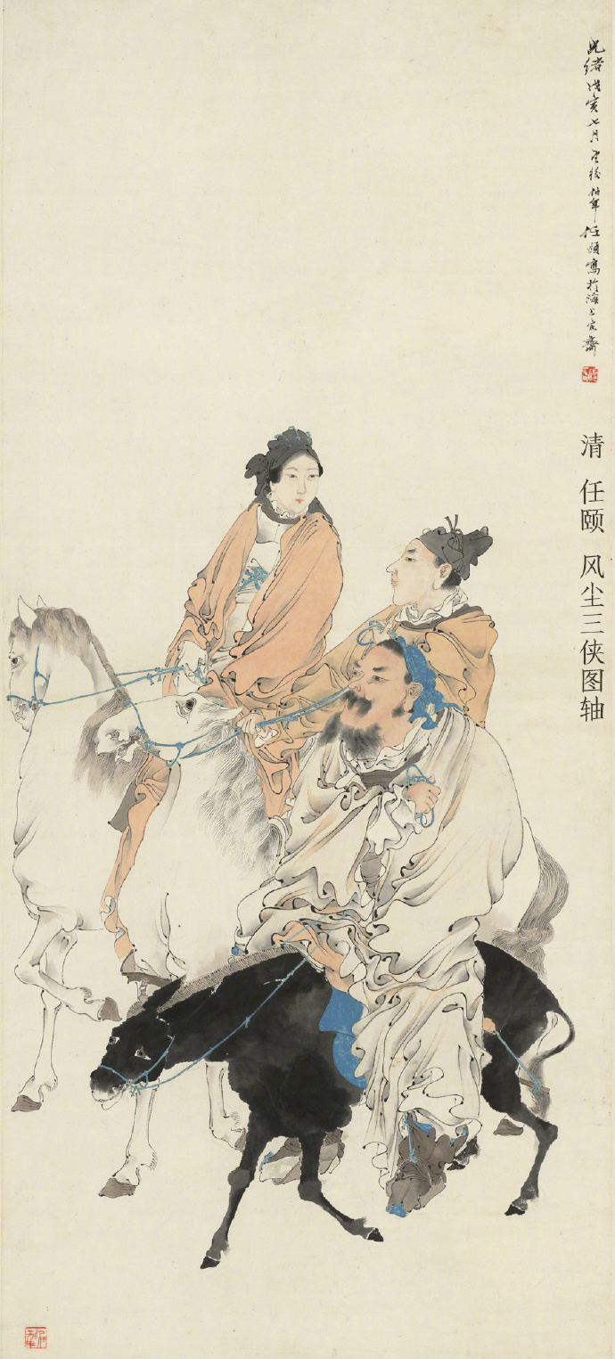 清,任颐,风尘三侠图轴。“风尘三侠”是依据唐代传奇小说《虬髯客传》之故事而流传于世的传奇组合,其成员为隋末唐初的三位英雄豪杰,即赤髯如虬、性格豪爽的虬髯客(本名张仲坚),具有卓越智谋与胆识的军事家李靖,以及慧眼识人、机智果敢的红拂女。三人因志同道合而结为挚友,一同闯荡江湖。图中虬髯客骑的是黑色的蹇驴,即跛足之驴,此细节尽显其不拘小节、豪放不羁的个性特征;李靖与红拂女夫妇,身着同款披风,均骑的是体型高大、肩胛宽厚的白马,尽显英姿飒爽之态。虬髯客、李靖、红拂女三人出身于不同阶层,最终皆以侠义精神为指引,在世间留下了一段传奇故事。