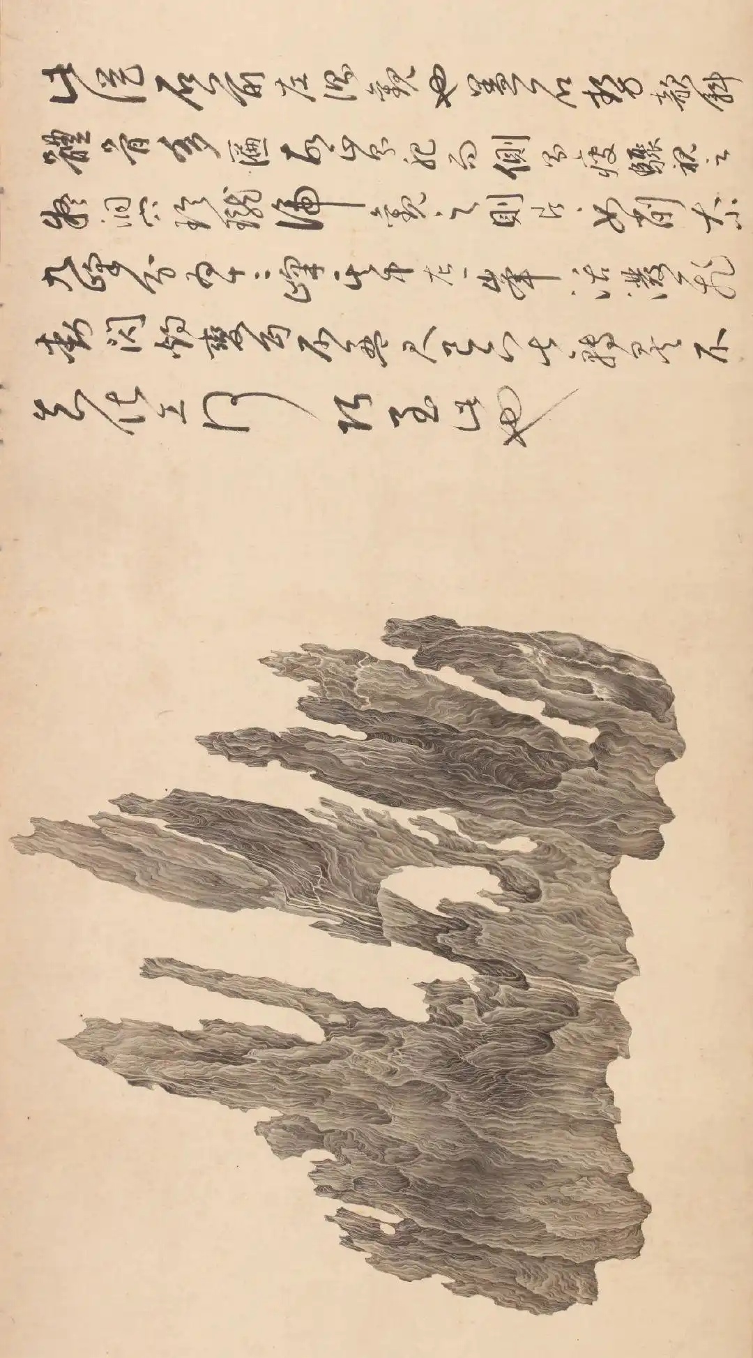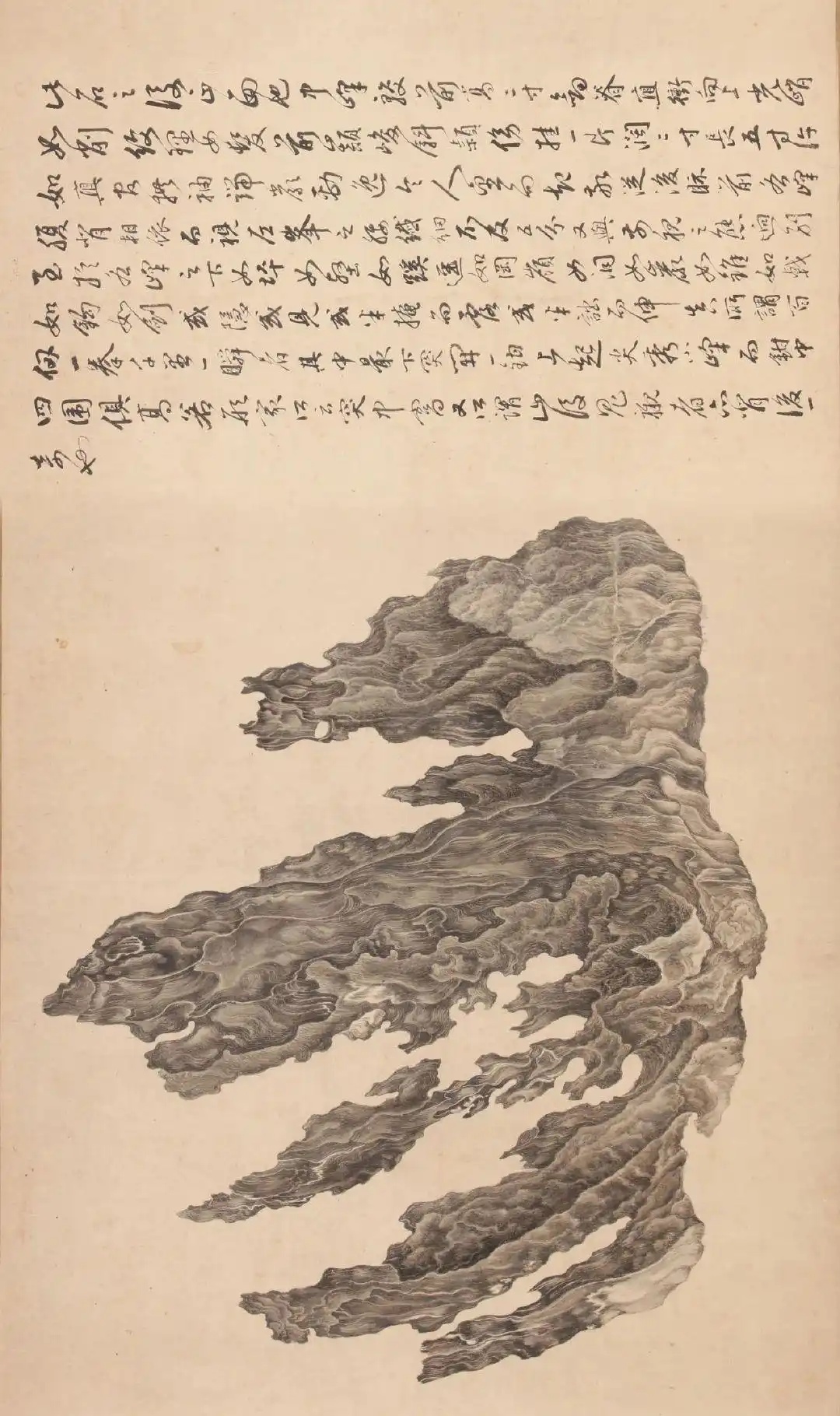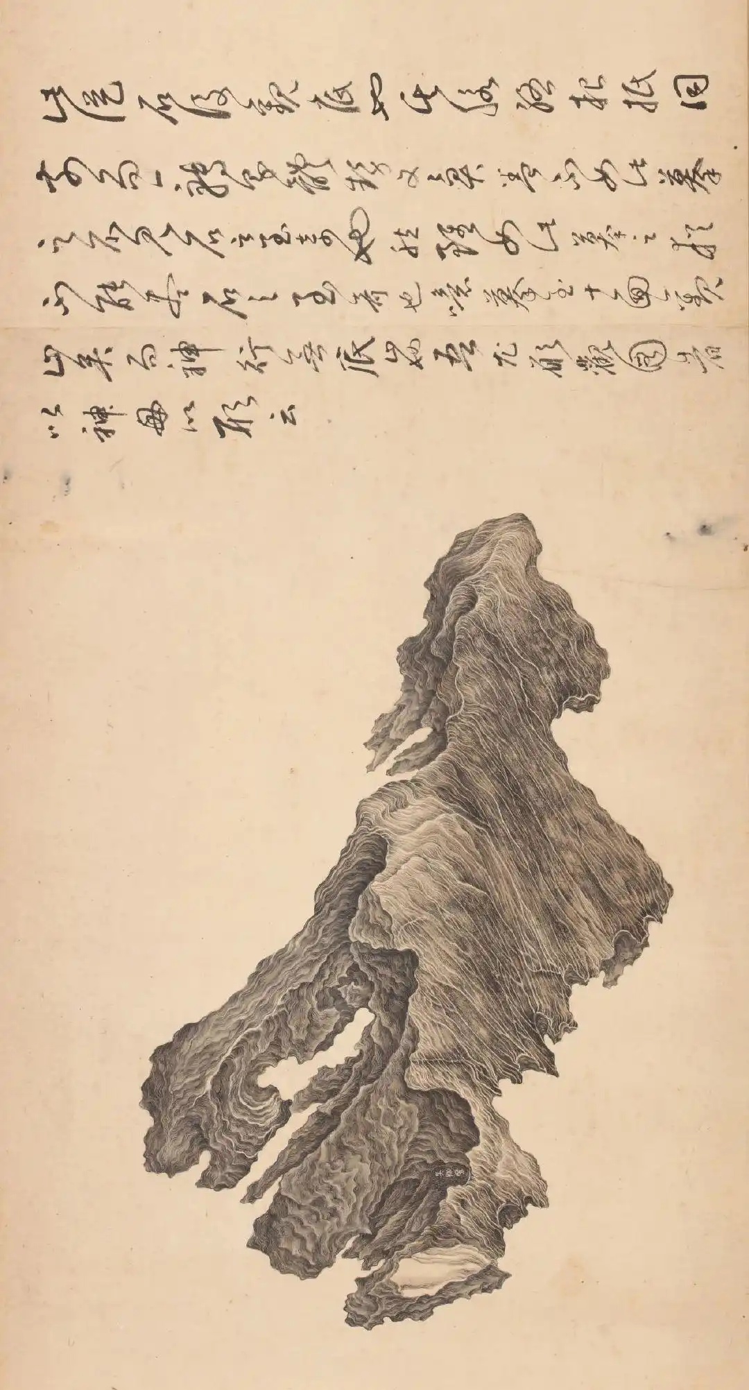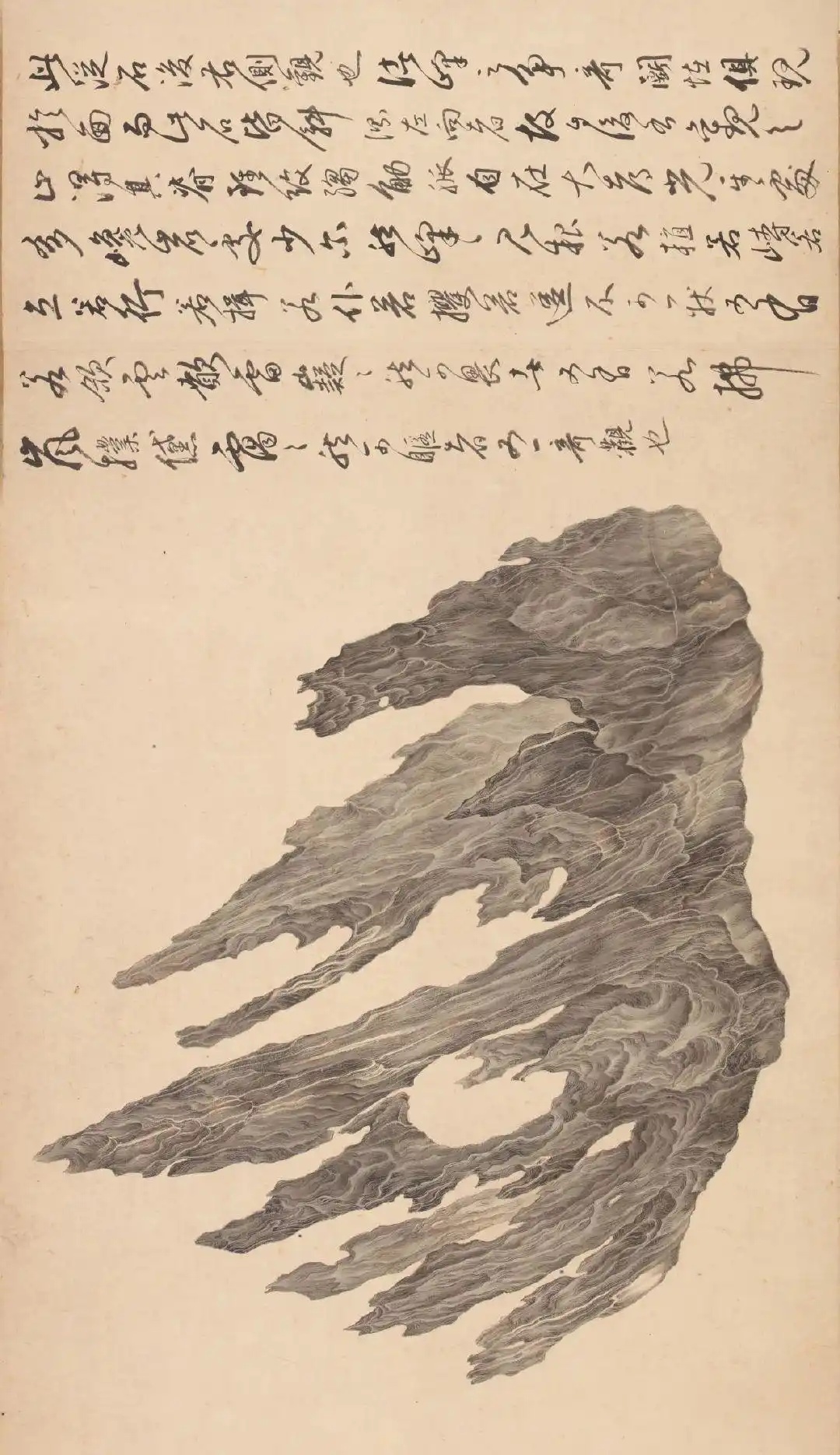 这幅作品,当时董其昌给它的评价是“洞天灵焰”,乃是赞叹吴彬借神来之笔,将一块静态的奇石刻画得如火焰般具焱锐之势。