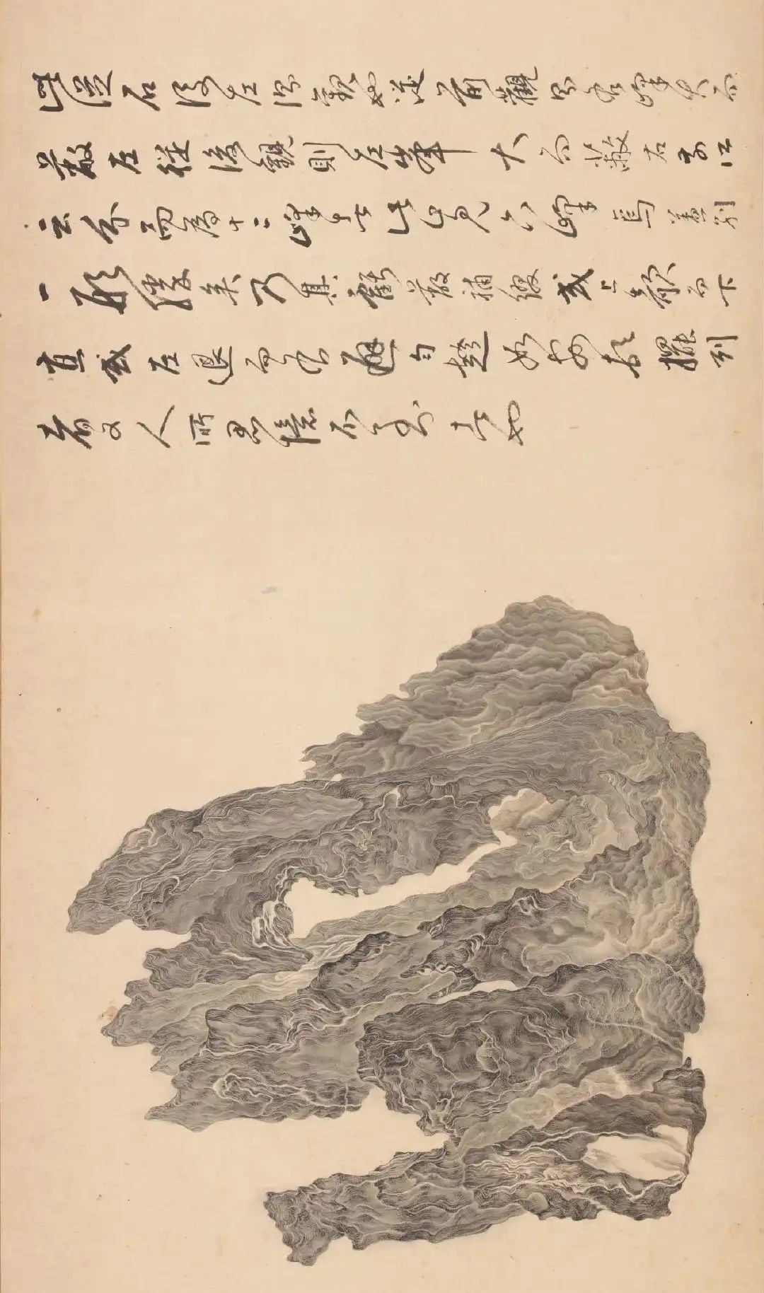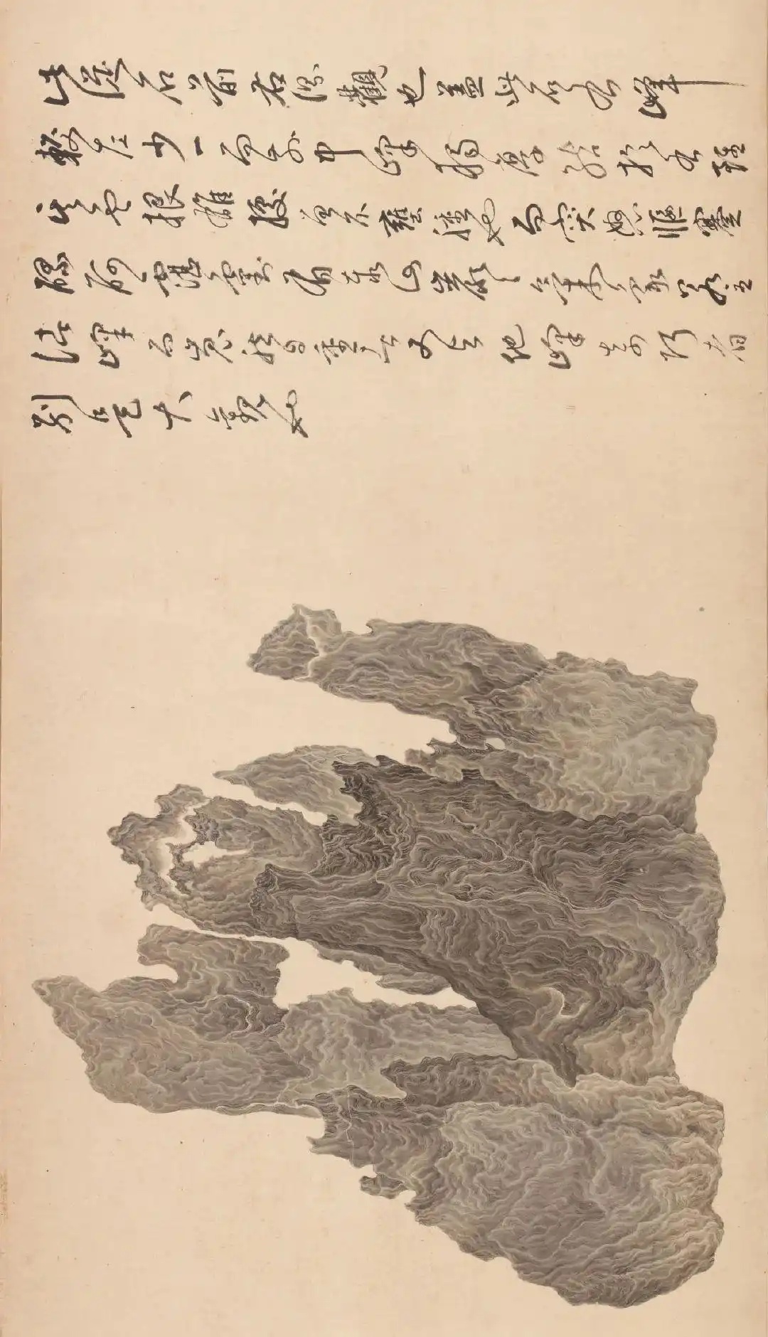 吴彬有个好朋友,叫做米万钟(是北宋米芾的后裔),米万钟和当时晚明许多文艺青年一样,很喜欢玩石头,1608年,他收集到了一块后来被命名为“非非石”的灵璧石,吴彬就把这块石头,从十个角度画了出来。米万钟很喜欢,还找了当时的董其昌等一众朋友,给它做了长长的跋。