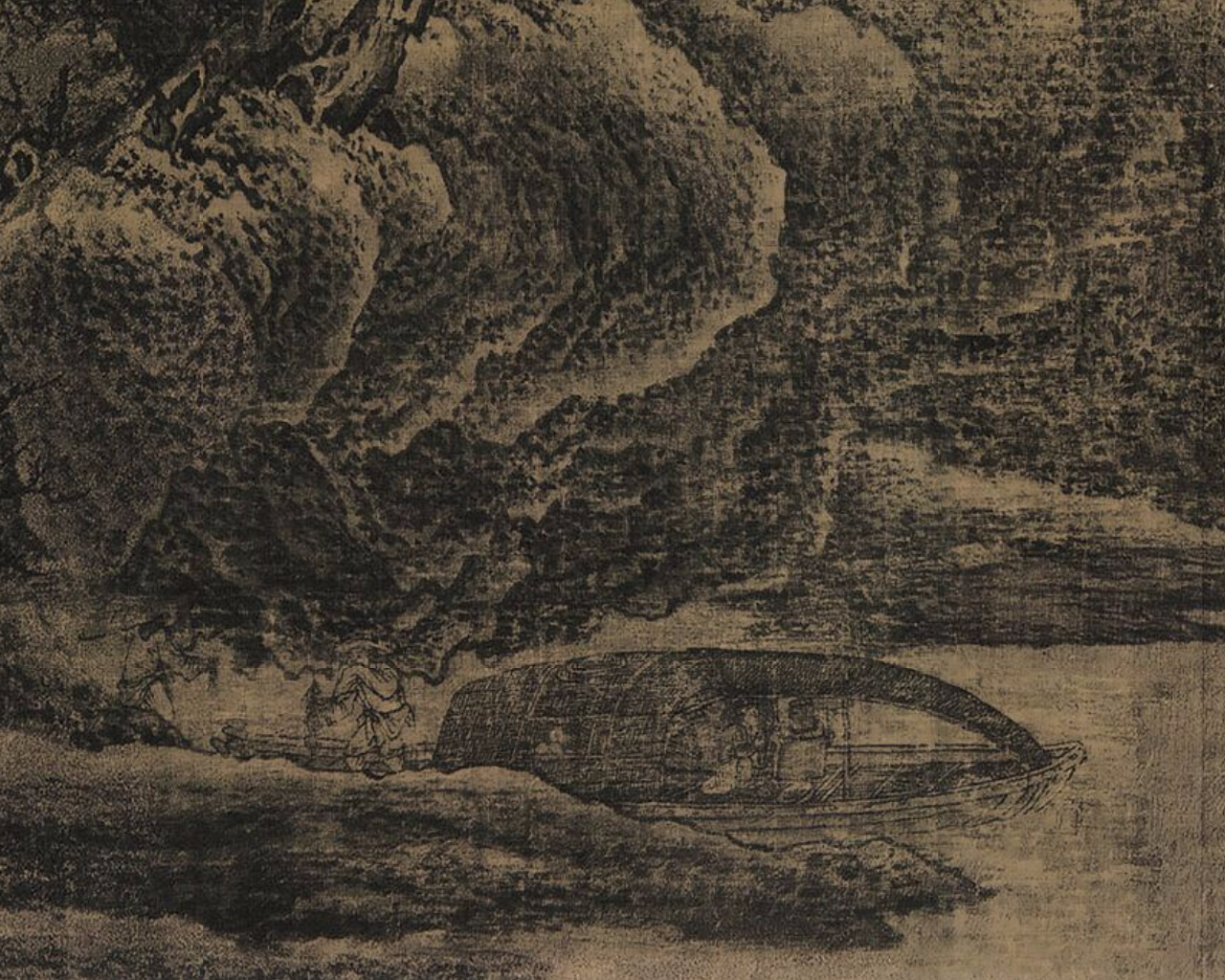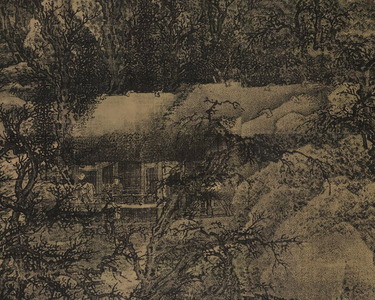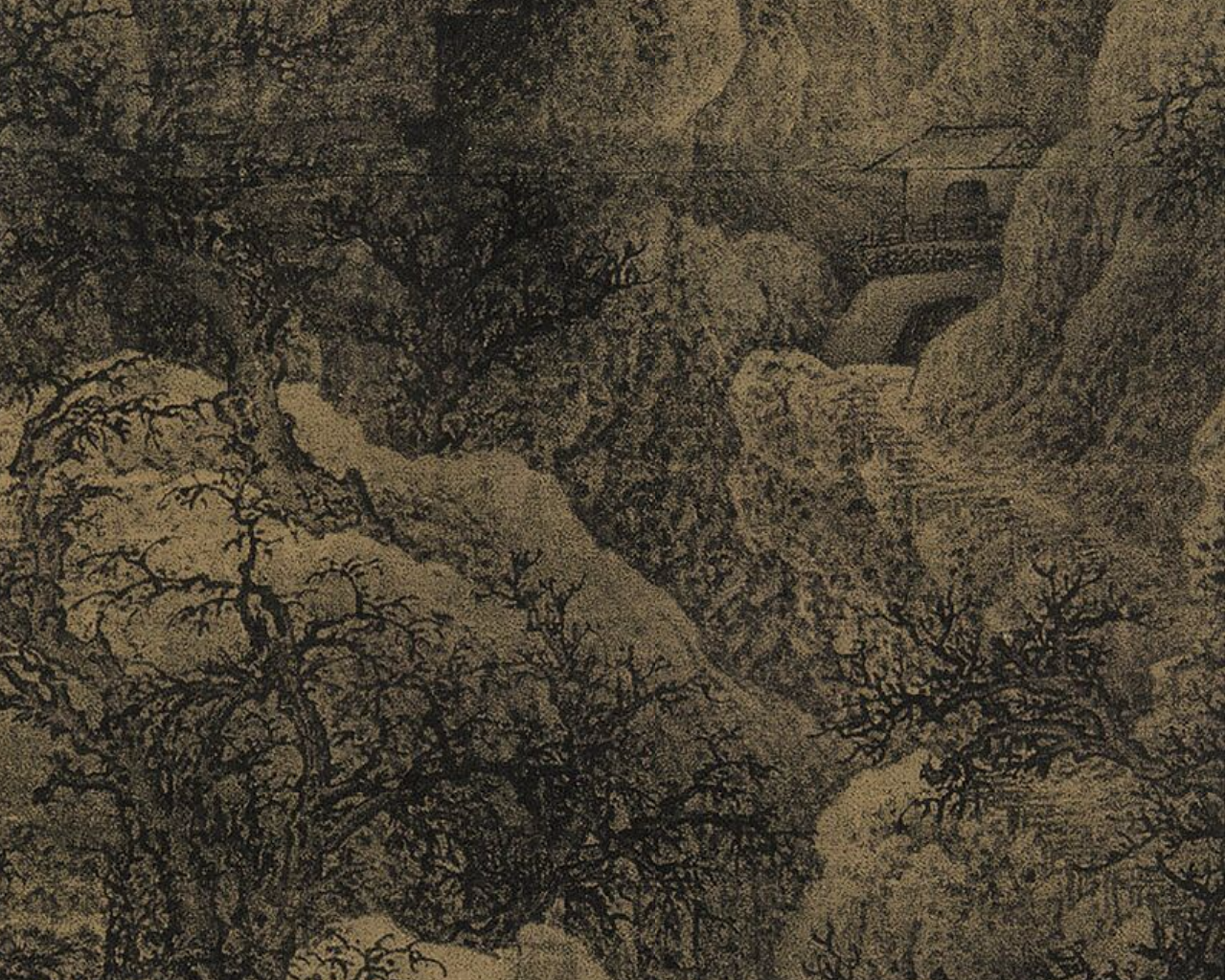 此画与《溪山行旅图》中的商旅有异曲同工之妙,左下渔夫卖鱼,山间小路上的行人冒匆匆赶路,山腰间楼阁殿宇隐现。此画皴法多是雨点皴,画中景抽绘树木,用笔遒劲,姿态各异,为画面平添生气。近处的柏树,笔法极其精彩。主峰作寒林密布,如茸似毯,密而不乱。是一幅非常优秀的宋代精品。