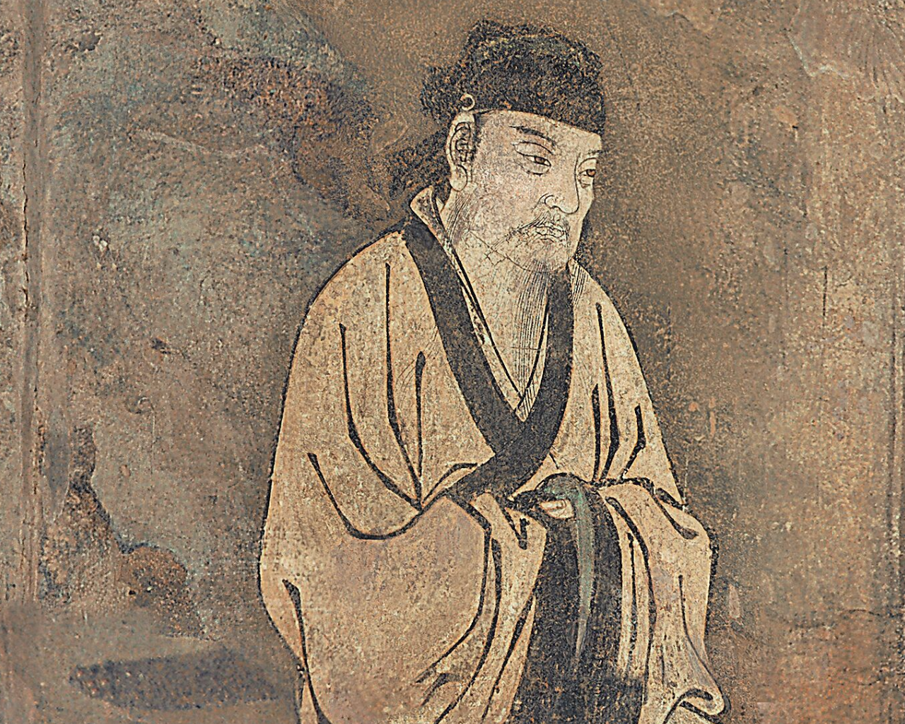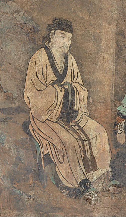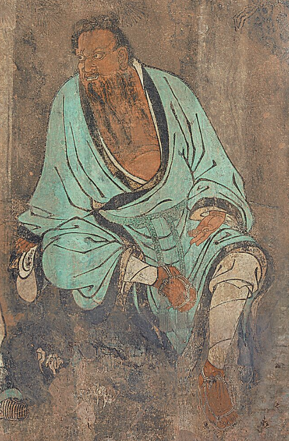 画面上,钟离权和吕洞宾对坐在石头上,身后有枯藤缠绕的老松。钟离权袒胸露腹,目光注视着吕洞宾,渴望听到对方的回答。左手伸出二指,告诉吕洞宾面前有两条道路可以选择。吕洞宾则拱手危坐,静听老师的教导,目光凝视,俯首沉思,整幅壁画笔法挺健,气韵生动。