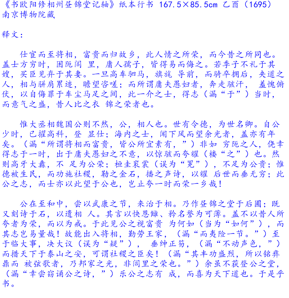 公在至和中,尝以武康之节,来治于相。乃作昼锦之堂于后圃;既又刻诗于石,以遗相人。其言以快恩雠、矜名誉为可薄。盖不以昔人所夸者为荣,而以为戒。于此见公之视富贵 为何如(当为“如何”),而其志岂易量哉!故能出入将相,勤劳王家,(漏“而夷险一节。”)至而将大下子家大之女误为谓社报之臣是绅其手功医动声所以铭弹鼎而 被弦歌者,乃邦家之光,非闾里之荣也。”)余虽不获登公之堂(漏“幸尝窃诵公之诗,”)乐公之志有 成,而喜为天下道也。于是乎书。