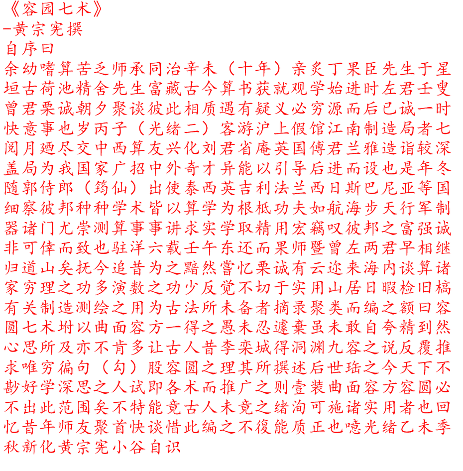 《容园七术》一黄宗宪撰自序曰余幼嗜算苦乏师承同治辛未(十年)亲炙丁果臣先生于星盖局为我国家广招中外奇才异能以引导后进而设也是年冬随郭侍郎(筠仙)出使泰西英吉利法兰西日斯巴尼亚等国细察彼邦种种学术皆以算学为根柢功夫如航海步天行军制心思所及亦不肯多让古人昔李栾城得洞渊九容之说反覆推求唯穷编句(勾)股容圆之理其所撰述后世瑶之今天下不勘好学深思之人试即各术而推广之则壹装曲面容方容圆必不出此范围矣不特能竟古人未竟之绪洵可施诸实用者也回忆昔年师友聚首快谈惜此编之不復能质正也噫光绪乙未季秋新化黄宗宪小谷自识