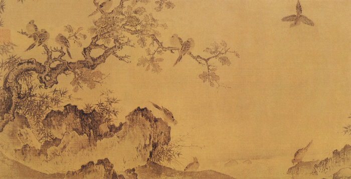 黄居寀(933-993后)〔五代〕字伯鸾,成都(今属四川)人,黄筌季子。擅绘花竹禽鸟,精于勾勒,用笔劲挺工稳,填彩浓厚华丽,其园竹翎毛形象逼真,妙得自然;怪石山水超过乃父,与父同仕后蜀,为翰林待诏。尝合作殿廷墙壁,宫闱屏幛,不可胜记。入宋仍任翰林待诏,尤得太宗看重,授光禄丞,委以搜访名画,鉴定品目。居寀与其父画格均富丽浓艳,适合宫廷需要,故黄氏在画院居于主持地位,其他画家要入画院,一时俱以黄氏画风为优劣取舍标准。淳化四年(993)出使成都府,时年六十一,在圣兴寺画有《龙水》《天台山》《水石》等壁画。《宣和画谱》著录其作品有《春山图》《春岸飞花图》《桃花山鹧图》等332件。传世作品有《竹石锦鸠图》册页,《山鹧棘雀图》轴,绢本,设色,纵99厘米,横53.6厘米,上方有宋赵佶题“黄居寀山鹧棘雀图”8字,横书,现藏台北故宫博物院。其兄居实、居宝都有画名,但英年早逝,名声不及居寀大。