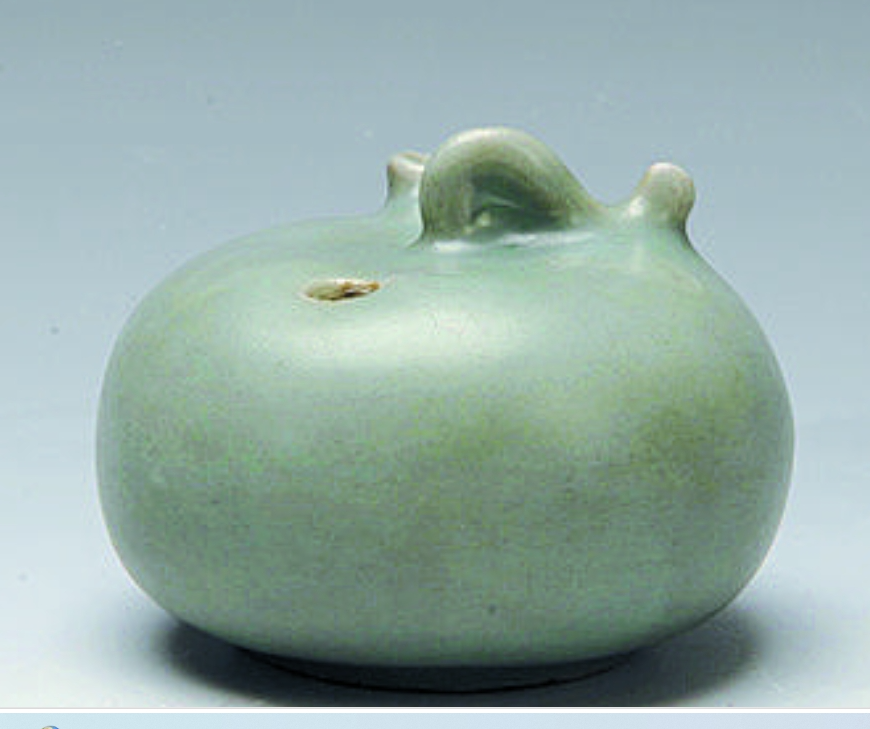这件瓷水注就像刚摘下来的“青柿子”,中空,扁圆,圆鼓腹,小巧别致,一掌可握。水注顶部中心部位微微下凹,围绕中心的五片柿叶花纹若隐若现,不同于传统“一尖两弯”的“柿蒂纹”,这是一种突破,因而更显清新。其中一个叶片间隙,贴有S形细泥条,形成半圆形藤钮。肩部一侧有一出水短壶嘴,另一侧有一圆形注水小孔。水注在使用时先在器体内贮水,移至砚台倒水时,可先用手指堵住注水孔,利用负压“吸”住器内之水,然后慢慢移开手指,根据墨汁的浓淡需求,注入不同水量进行研墨。实际上,这是应用了水注内外大气压强差来控制水流,在有限的空间上实现功能与美观的和谐。瓷水注通体施青釉,釉面光润细腻,足底支烧处呈现火石红特征。器型精致灵巧,釉色莹润淡雅,展现出文人精致清雅的审美趣味。它不仅是南宋文房精品,更见证了龙泉窑在青瓷史上的美学高峰。