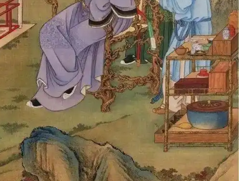 而在捧茶的小仆身边有个二层的竹架,上面排放着各式精美的茶具。这些茶具为我们认识清朝宫廷茶器具十分有帮助。我们可以先从最上面这层看起:有祭红的和青花的茶叶罐,祭蓝的茶碗、玉碗、青花盖碗、黑色描金漆盘,上有青花小杯,还有一把宜兴紫砂壶。在清朝,宜兴紫砂已经非常流行,同样在清朝大行其道的还有盖碗。可以说盖碗的使用,是清代品茗的一大特色了。再看竹架的第二层,有一描红的茶叶罐。竹架第三层我们发现有一个青蓝釉水缸,旁边还有一个水勺。最下面的抽屉里放置的是木炭。画中很多件器物在现实中都可以发现其原型。比如玉碗、青花茶叶罐、第三层的青蓝的水缸与雍正朝的青金蓝釉缸非常类似,甚至我们可以推测乾隆初期使用的茶器很有可能沿用了雍正时期所制的器物。