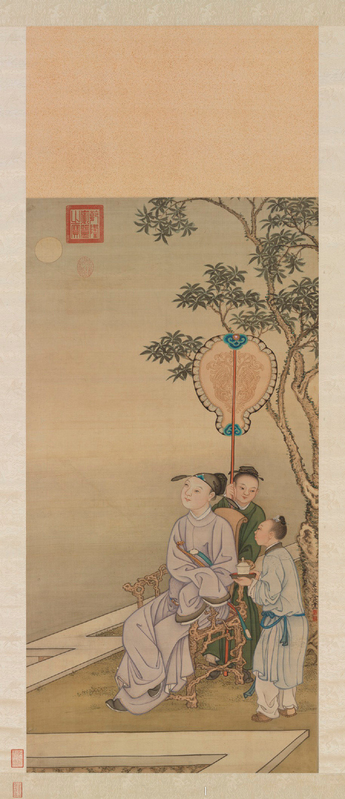 冷枚,字吉臣,康熙(西元一六六二–一七二二)时宫廷画家,擅长画人物、山水。农曆八月十五是一年秋季正中,所以称中秋,是桂花盛开、飘香的季节,此时月光也最为明亮皎洁,是赏月最好时节。中秋赏月在唐代已是约定俗成的传统节日,有阖家团圆赏月,也有三五好友相聚登楼赋诗,而此幅士人静坐独赏清辉明月,别有一番情趣。画中阴阳明暗的表现,是受到西洋光影技法的影响。