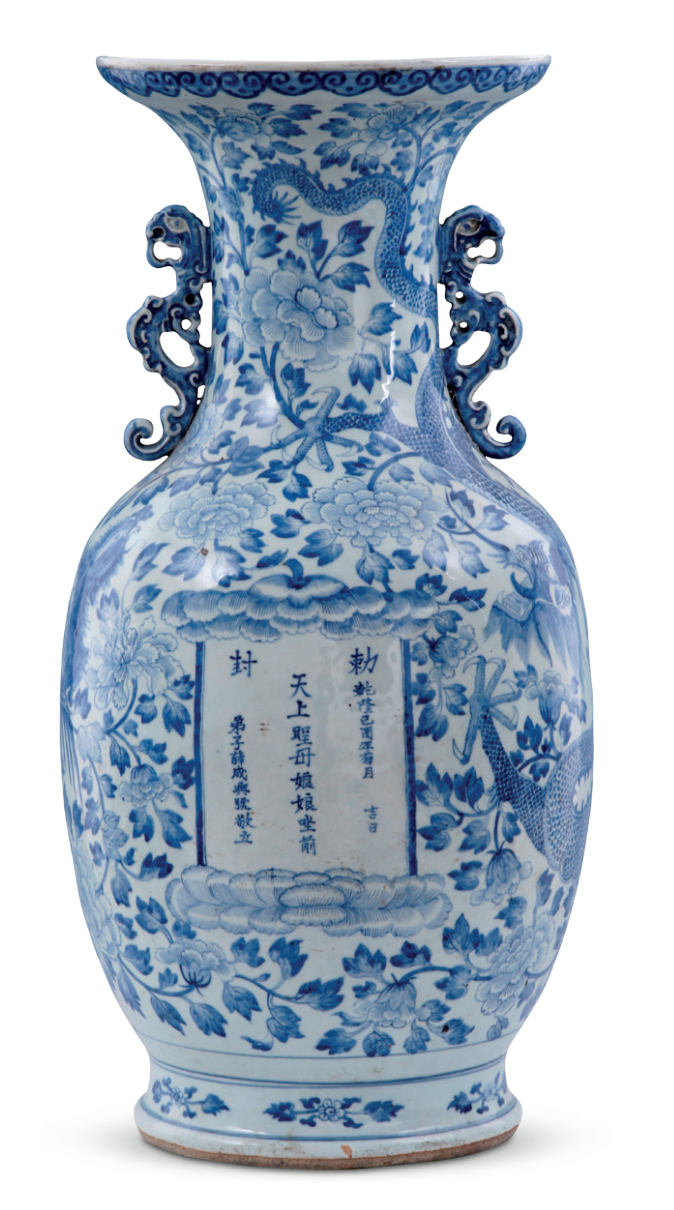 青花龙凤纹双耳大瓶概述青岛市博物馆藏的清乾隆青花龙凤纹双耳大瓶,1976年征集入藏。从胎质、釉质、青花发色来看,为景德镇民窑所产。瓶体硕大,高达78、口径32.5厘米。大瓶外口沿下绘一周如意云头纹,胫部饰有5组折枝花卉纹。器身以青花满绘龙凤牡丹纹,是为主题纹饰。龙凤牡丹纹是清代瓷器上的传统纹样,寓意“龙凤呈祥,富贵祥瑞”。器腹部有矩形开光一处,内书铭文:“敕封,天上圣母娘娘坐前。乾隆已酉年菊月吉日。弟子薛成兴号敬立”。此瓶可作为乾隆朝这类大瓶断代的标准器。