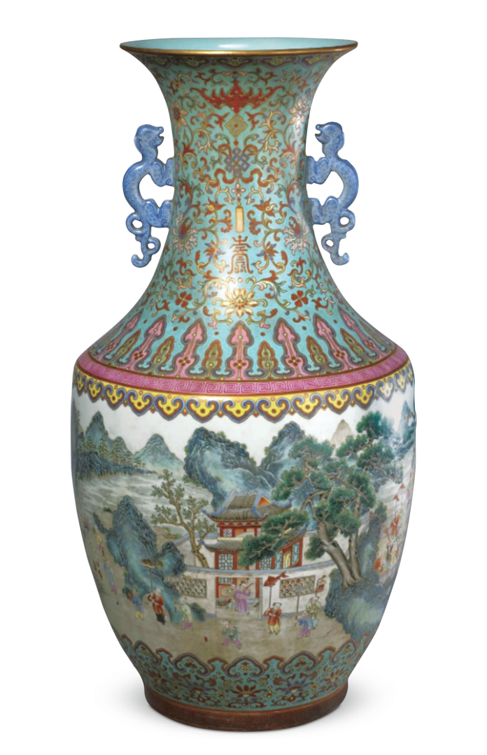 故宫博物院藏清乾隆绿地粉彩婴戏纹双螭耳撇口瓶,口径26、足径24、高75厘米。瓶颈部饰有双螭耳,外颈部以松石绿为地,上饰粉彩缠枝花纹,间有蝙蝠、“寿”字、“卍”字纹带。腹部绘有亭台楼阁、婴戏通景图。足内施白釉,以青花篆书“大清乾隆年制”六字三行款。
