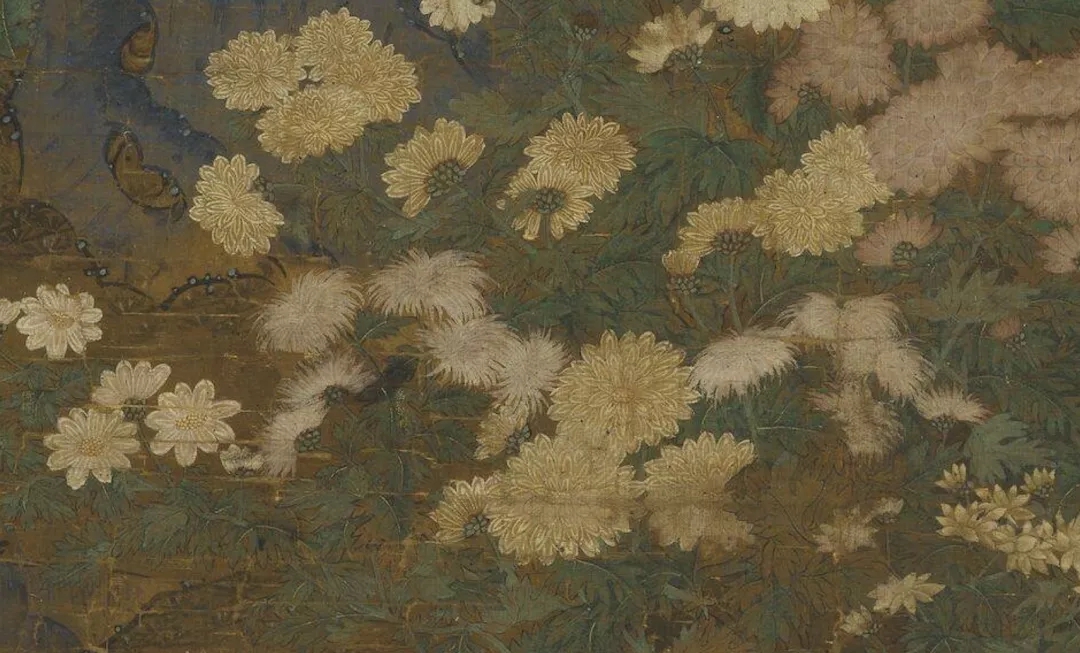 元代《丛菊图》有创作独特之处。在绢的材质上,画面塑造了上百朵菊花,以奶白色为主,辅之浅蓝、紫色、淡紫与浅黄等不同色泽的菊花。花多而不娇艳,花头以硕大为主,参差有平顶与攒顶的不同形态。菊花的花枝是花的支撑,此作的枝梗基本上用中锋钩出,劲逸有力,疏密自然,叶子虽然多有重叠,但层次依然犹如天成。