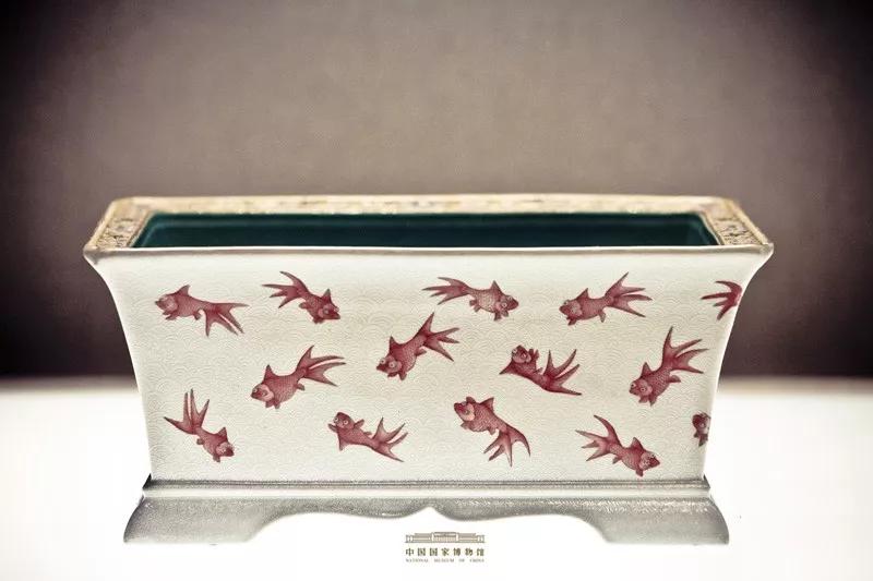 “鱼”与“玉”同音,金彩描绘鱼纹寓有“金玉满堂”。金玉满堂形容财富众多。在白釉上刻划水波纹为地,道光、咸丰时期瓷器上较为常见。白地红彩,施彩艳丽夺目,金鱼描绘生动,活泼自然,此器为清代咸丰官窑的精细之作。