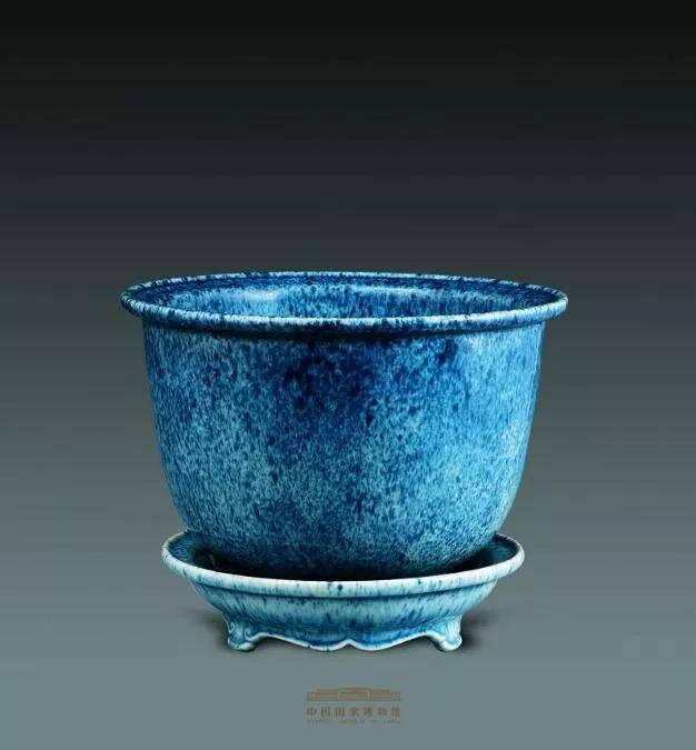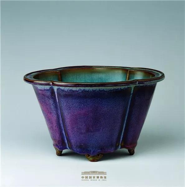 这只花盆口呈海棠式,晶莹的天蓝釉色中映现出宛若玫瑰般的紫红,极其斑斓。外底刻“重华宫”、“金昭玉翠用”等楷书题字,为清宫旧藏。