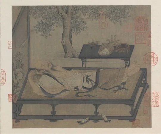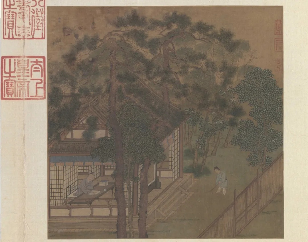 该画作描绘的是文人雅士所向往的闲适生活。长松掩映的书斋内,长案临窗陈设,案头隐现一只小巧香炉——恰是宋代文人“读书必焚香” 的生动注脚。