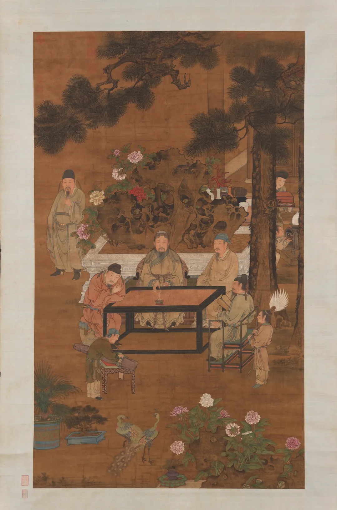 画面背景简洁,如盖的青松和摇曳的绿竹衬托出庭园高雅脱俗的环境,而几案上香烟袅袅的白瓷高足香炉与玲珑石上栽植着异卉的古鼎与优雅琴声一道,营造出“香中得静境,琴上觅知音”的玄远意境。