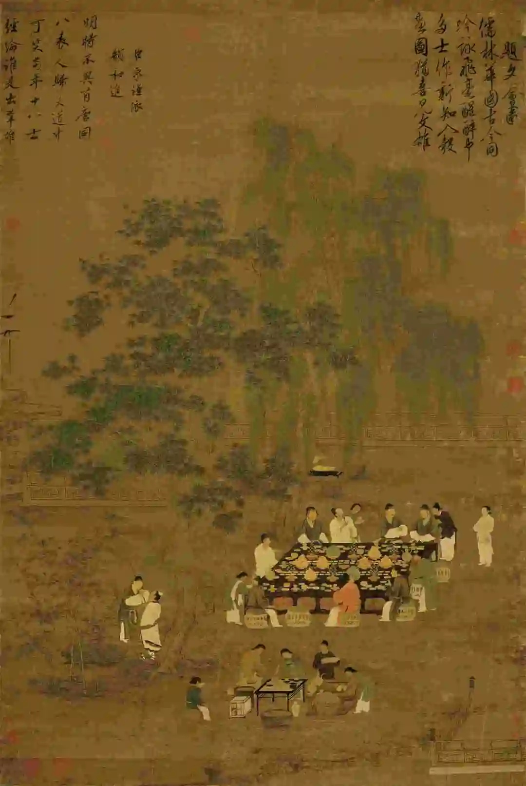 此幅描绘官僚贵族雅集听琴的场景。主人公道冠玄袍,居中端坐,凝神抚琴,前面坐墩上两位纱帽官服的朝士对坐聆听,左面绿袍者笼袖仰面,右面红袍者持扇低首,二人悠然入定,仿佛正被这鼓动的琴弦撩动着神思,完全陶醉在琴声之中。叉手侍立的蓝衫童子则瞪大眼睛,注视着拨弄琴弦的主人公。