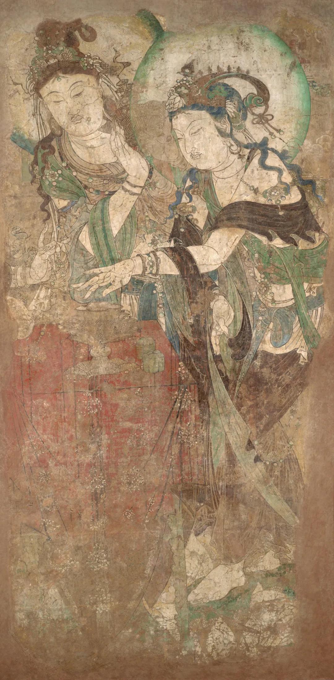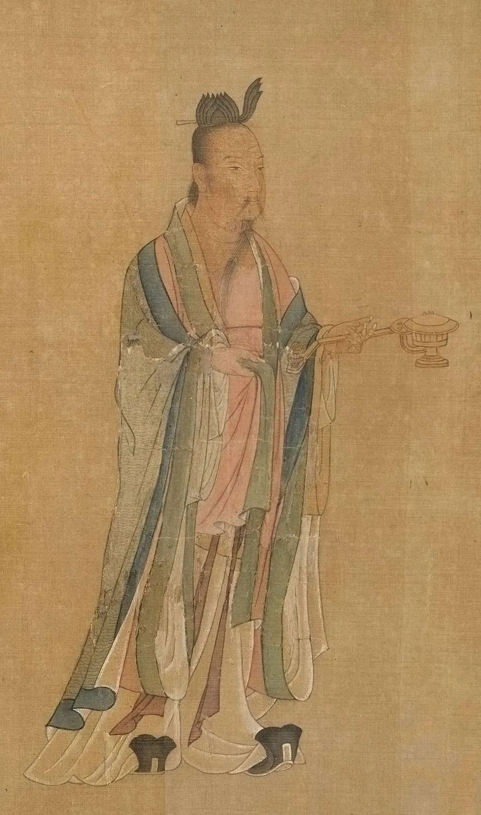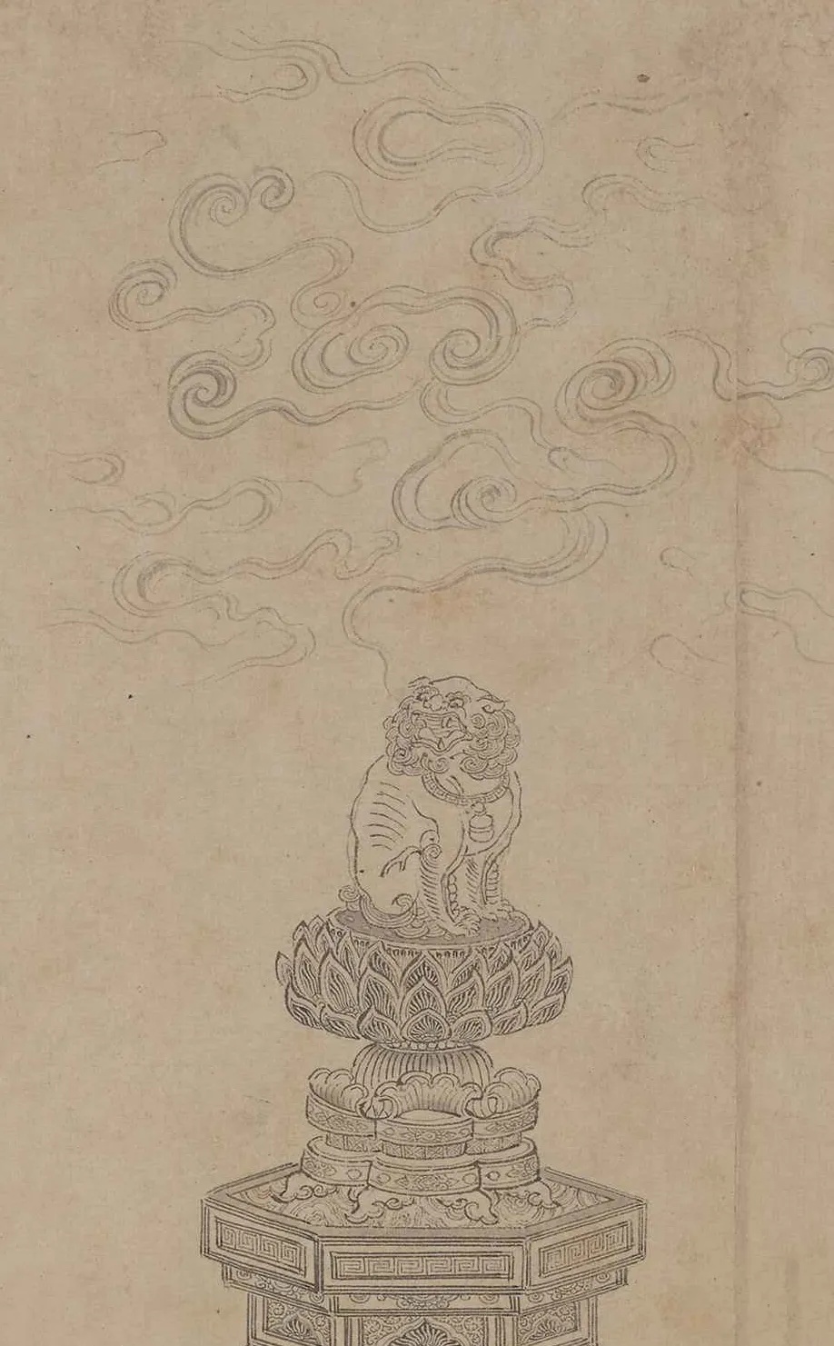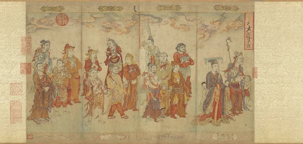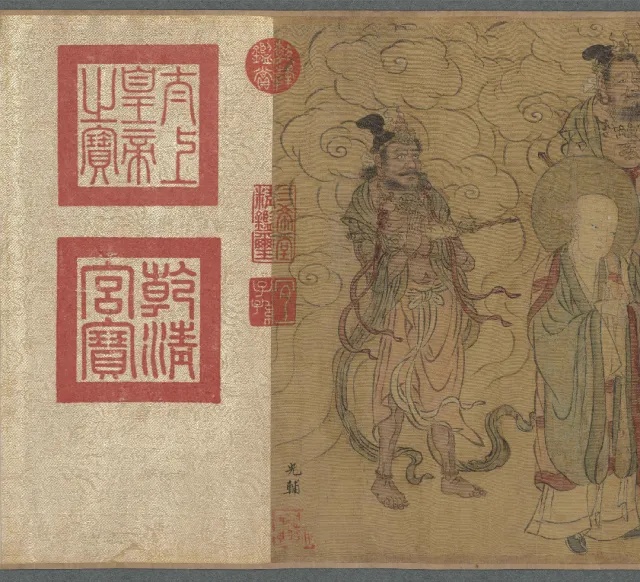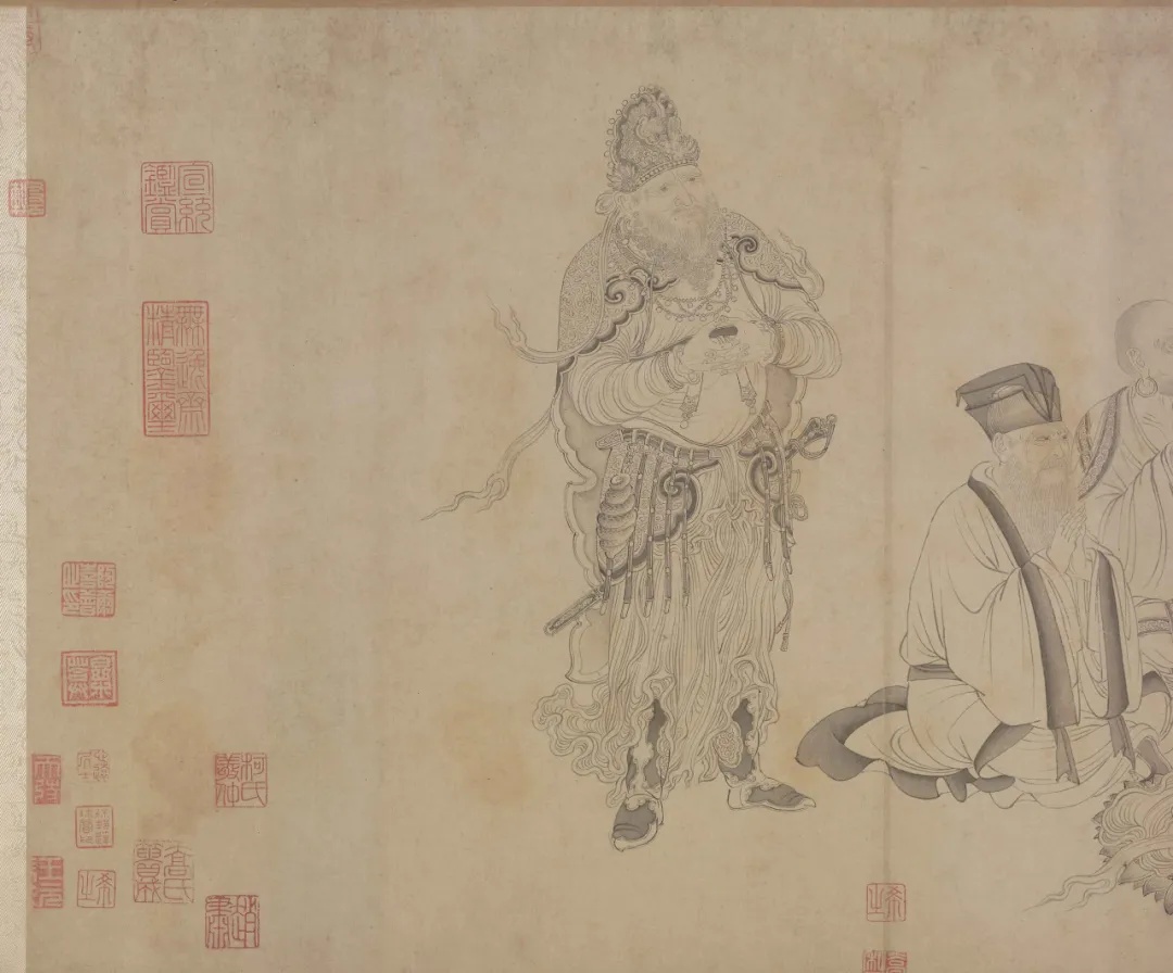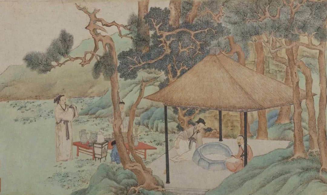 此幅宋人仿作,画学士四人围几而坐,另一学士抚须而立,温文儒雅,神情泰然。园中松树挺立,芍药盛开,奇石并陈,尚有两只孔雀闲立。 全图设色雅正,值得注意的是在画面中央的黑漆瘿木面案几上,一座青铜香炉巍然屹立,炉内升起的袅袅青烟与后方苍松形成“松龄鹤寿”的祥瑞意象。画中香烟的走向与人物视线形成微妙呼应,仿佛将琴韵、茶香、花气融为一体,既为听琴营造 “澄心凝神” 的静谧氛围,又以香气串联起文人的精神共鸣,诠释了宋代 “香助琴思” 的内涵。 在即将开始的琴会之前,焚香已成为营造意境的重要仪式。 《文会图轴》 赵佶 北宋 184.4x123.9cm 绢本设色 台北故宫博物院 本幅描绘一群文士在池畔园苑中饮宴的情景。柳荫环抱的庭院内,文人围案而坐,或吟咏或闲谈,尽显 “儒林华国” 的盛景。人物均神情雅俊、眉清目秀,器用、园景描绘细致讲究,应为徽宗朝画院的精工之作。 画面右侧柳荫下的石几上,一尊青铜鼎式香炉赫然在目。其形制仿自商周青铜器,双耳立起,三足外撇,炉身素面无纹,仅以线条勾勒出庄重轮廓。这种造型呼应了宋代“复古” 思潮。香炉的位置设计暗含深意:它与古琴、书卷共置一石,将焚香从单纯的嗅觉体验升华为文人精神世界的隐喻。 据《陈氏香谱》记载, 宋代合香遵循 “君臣佐使” 原则,以沉香为君,檀香为臣,龙脑为佐,麝香为使,通过精密配比达到 “中和” 之境。 《槐荫消夏图页》 佚名 宋代 25.9cmx25.2cm 绢本设色 故宫博物院 夏日槐荫下,文人卧于藤床消夏,身旁书案置一简约香炉,青烟袅袅与树影、清风交织。香气驱散暑气,更助文人澄心静养,尽显 “心静自然凉” 的禅意,香炉与书卷并置,暗示着焚香与阅读皆是文人内在修持的途径。作品通过极简的物象安排,展现了宋代文人将香事融入日常生活的美学实践——在炎炎夏日,一炉清香便可构筑起超然物外的精神空间,实现“身居尘世,心寄清凉”的生命智慧。 香炉虽小巧朴素,却居案心显要位置,恰是宋代文人 “燕居焚香” 的生动写照。 《秋庭书壁图轴》 佚名 元代 133.8x79.9cm 绢本设色 台北故宫博物院 本幅原属一组四张图画,以春、夏、秋、冬四景,分绘文人从事琴、棋、书、画活动。可以看到庭院一角,高大枫树与梧桐树下,文人雅集。中景一人挽袖题壁,书童在后研墨,旁有观者凝神。曲栏环绕,古木参天,营造出秋高气爽的雅致氛围。另有小童数人,或捧书卷,或持茶盏,其中一人正专注于整备香几上的香炉助兴,体现 "闻馨香而悦目" 的文人雅趣。 秋季 是阳气渐收、阴气渐长的过渡期, 古人视此为焚香养生的最佳时节 《西园雅集图轴二》 仇英 明代 86.6x30cm 纸本设色 台北故宫博物院 画作以细腻笔触复刻西园雅集盛景,园林松竹掩映间,文人或挥毫、或清谈,氛围清雅。局部绘文人围坐案上香具陈列。作品通过细腻的笔触,展现了明代文人对宋代雅集传统的继承与发展。 《惠山茶会图卷》 文徵明 明代 21.9cm×67cm 纸本设色 故宫博物院 据蔡羽序记,正德十三年二月十九日,文徵明与好友蔡羽、王守、王宠、汤珍等人至无锡惠山游览,品茗饮茶,吟诗唱和,十分相得,事后便创作了这幅记事性作品。 画面采用截取式构图,突出“茶会”场景,在一片松林中有座茅亭泉井,诸人冶游其间,或围井而坐,展卷吟哦,或散步林间,赏景交谈,或观看童子煮茶。 画面虽以茶为中心,但竹炉旁隐约可见一精致香炉,青烟与松涛、泉声共同构建 “天人合一” 的意境。文徵明将焚香与品茗、论道结合,暗合《遵生八笺》中 “香助茶兴” 的理念,体现明代文人对宋代雅韵的承袭与升华。 从琴堂到书斋,从雅集到山涧,从宫廷到隐逸,这些画作中的一缕缕青烟,不仅定格了炉瓶三事的器物之美,更承载着文人对 “清、雅、淡、远” 的精神追求。 文化 02 梵音凝香 宗教仪轨与香祈 香,自远古便是沟通天地人神的神圣媒介。在佛寺道观的庄严空间里,在帝王朝拜的隆重仪仗中,那一缕青烟承载着信仰的虔诚,构筑起通往神圣世界的桥梁。 《温县慈胜寺五代壁画》 菩萨敬香图 菩萨焚香图 佚名(五代);丘余庆 五代 175.26cm×90.17cm×3.81cm 泥质壁画 纳尔逊艺术博物馆 此画为五代后周广顺二年(952 年)的佛教壁画珍品,原为河南温县慈胜寺壁画群的核心部分,经历史劫难仅存残片。此图作为现存最早的菩萨持炉图像之一,呈现了佛教中国化进程中香事仪轨的定型。画面中菩萨宝相庄严,身姿微俯,双手持一造型精美的长柄香炉,炉中香烟袅袅升腾,形成流畅的涡卷纹样,与菩萨身后飘逸的天衣形成巧妙呼应。 《番王礼佛图卷》 赵光辅 宋代 28.6x103.5cm 绢本设色 克利夫兰艺术博物馆 宋代是宗教香事的鼎盛时期,多元信仰的融合在香事中尽显。本作以精湛的白描手法,展现了异域番王礼佛的庄严场景。画面中,与释迦牟尼相对的长者手持长柄莲花香炉,炉身造型精美,其后随从分别持金色杯式香炉、青色香炉及蛟龙纹金盘,盘中盛放燃烧的香丸,形成完整的香事仪仗。 值得注意的是,所有持炉者皆以双手恭捧,这一细节既体现了对佛陀的最高敬意,也彰显了宋代宗教用香的严谨仪轨。长柄香炉便于行进中使用,杯式炉适合静置供奉,而金盘燃香则延续了古印度香事传统,三种香具的同时出现,展现了宋代宗教香事文化的丰富性与包容性。 《老君别号事实图卷》 王利用(传) 宋代 44.78x387.35cm 绢本设色 纳尔逊艺术博