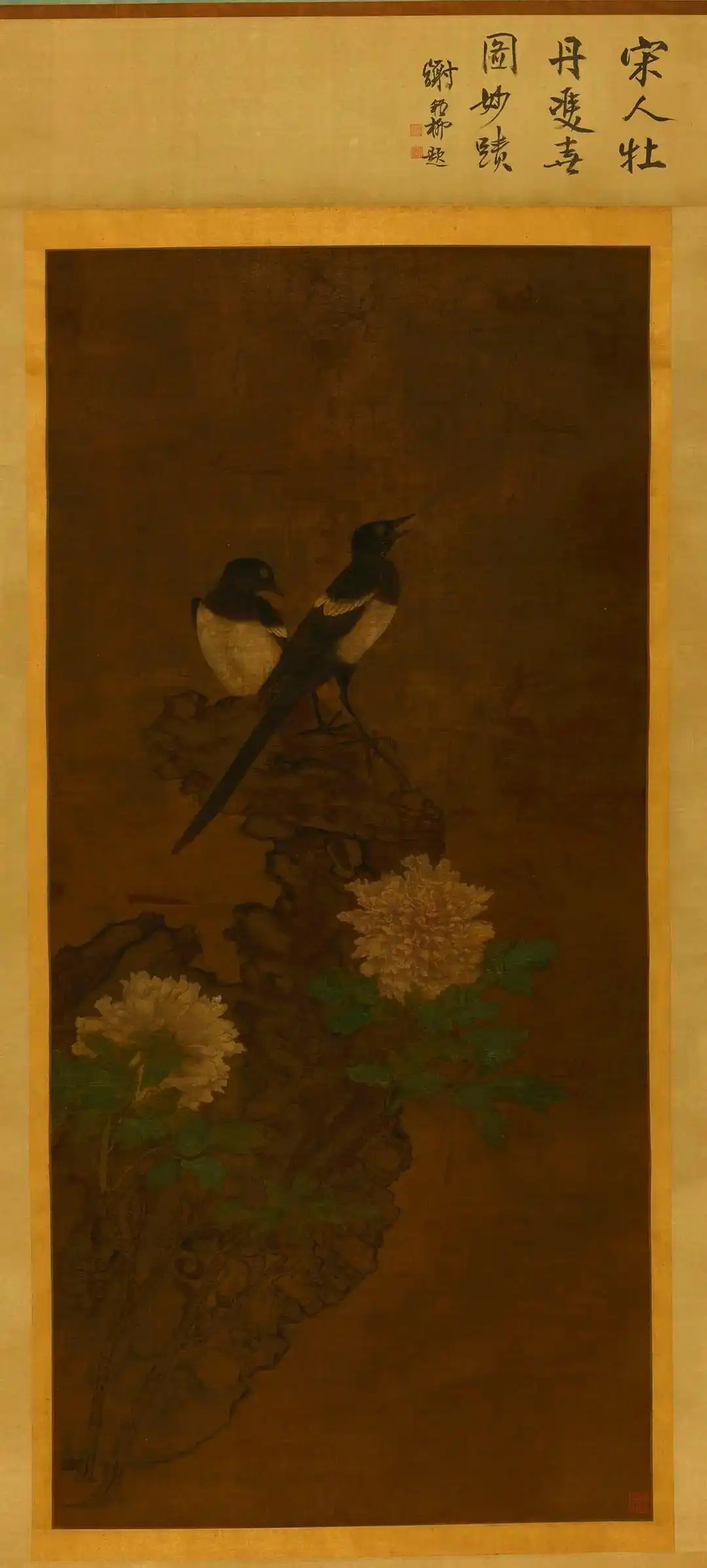 在宋人的花鸟画中,画作者总是以亲和的姿态向欣赏者呈现大千世界那美妙的生命体。在花鸟虫鱼绘作中,画家倾心创作,一笔一墨中都潜流着无尽的意趣与情思。他们所绘就的心血,既是对大自然生命的惊奇,也是其诗情的绽放。牡丹,花中富贵者,中国的传统名花之一,其以花大色艳,形美香浓而著称。牡丹在中国传统文化中有着重要地位,象征着吉祥富贵、繁荣昌盛。众多文人画家都曾以牡丹为题,创作大量作品。喜鹊在古代中国便具有丰富的象征意义,通常被视为幸福与好运。牡丹与喜鹊的结合是中国古代绘画创作中的常见形式,寓为吉祥如意,事事顺心。两者的结合,不仅在视觉上给人以美的感受,更在文化上承载了深厚情感,表现出人们对美好生活的向往与追求。《牡丹双喜图》即是一幅牡丹与双鹊相结合绘就的佳品,纵132.0厘米,横62.5厘米,绢本设色。绘作画面简约,但主体突出,喜鹊、假山石和盛开的牡丹。三者分别采用了不同的绘画技法。其中牡丹描绘最为精细,花瓣的层次分明,色彩晶莹剔透又十分丰富,从淡雅的粉色到鲜艳的红色,而喜鹊的白色羽毛又与牡丹的多彩形成对比,增强了画面的视觉效果;喜鹊兼工带写,脚趾和翅膀上的白色羽毛描绘精细,但大片的黑羽则较粗略;而山石,则基本上是写意居多的没骨画法。此幅《牡丹双喜图》展示了宋代花鸟画高超的技艺与丰富的内涵,是中国传统文化的重要载体,通过这幅画我们能够进一步深入了解中国绘画艺术的魅力与深度。