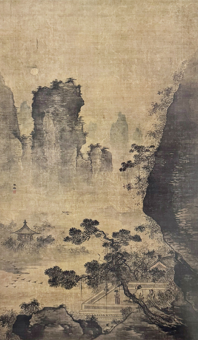 《楼台玩月图》描绘高士于山间临水高台上览赏月色之景。近处,古松横斜而出,枝头一只白鹤正对着空中翱翔的同伴伸颈长鸣。中景处,一位高士面水而坐,昂首凝望;对面群峰兀立,峰巅一轮皓月高悬;月华之下,雁群排成“人”字长队飞向远方。一水之隔的对面,隐约可见云雾中有一座江亭,为山水风光更添一分灵秀。全图将明月、树影、群山与高士融为一体,烘托出深夜赏月的雅趣,更构建出一处令人心驰神往的精神桃源。