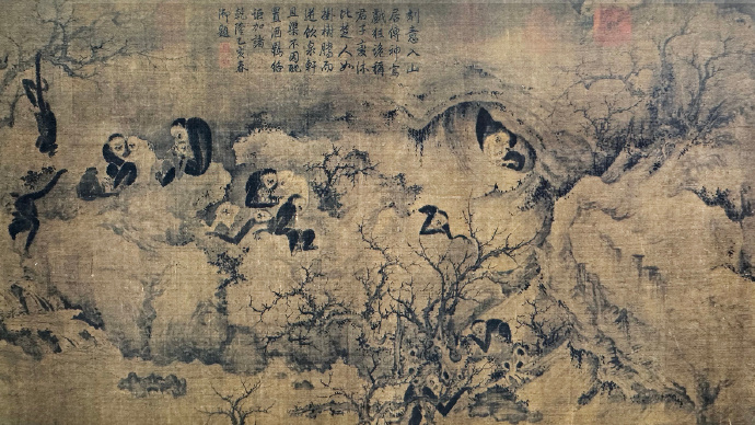 《聚猿图》描绘了近三十只猿猴的不同情状,它们或攀援、或顾盼、或呼应,无不灵动自然、情态逼真。猿在中国传统文化中寓意友爱、仁义,又有长寿、祥瑞之喻。本图细致入微地捕捉猿猴的瞬间动态,并以富于节奏的构图组织画面,使群体关系层次分明、动静相生,既展现出自然野趣,也包含着对群体秩序与人伦关系的隐喻。