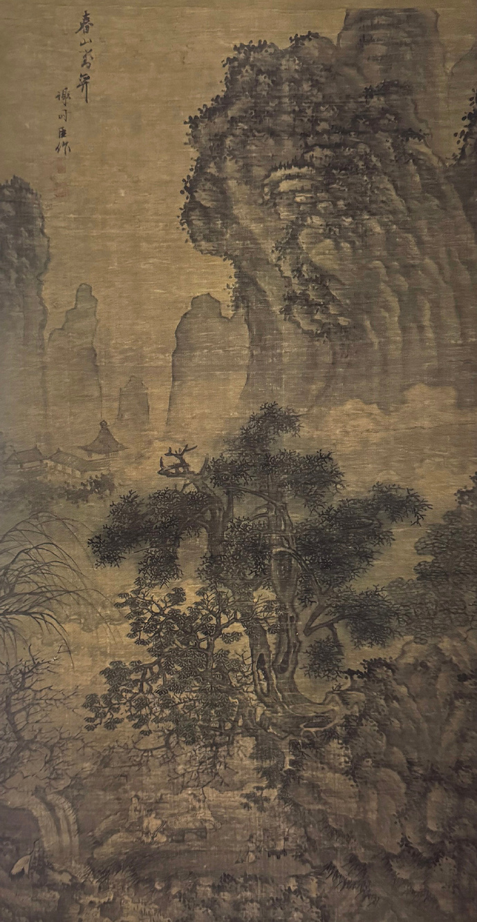 《春山对弈图》刻画高士于高山流水中以棋会友的情境。画面近处,古柏昂然耸立,四周桃柳及杂树环绕,郁郁葱葱;更有两株花树探向棋桌,春意盎然,点明画旨。两位棋手屏息凝神,全神贯注,另有一人观棋赏瀑,悠然自得。不远处还有一童仆,正围炉煮茶。画作中远景描绘巨峰耸峙、飞瀑垂悬,其间亭台楼阁隐约可见。全图尺幅不大,但布局明晰,重重景致层叠蔽覆,相辅相成,气势恢宏。