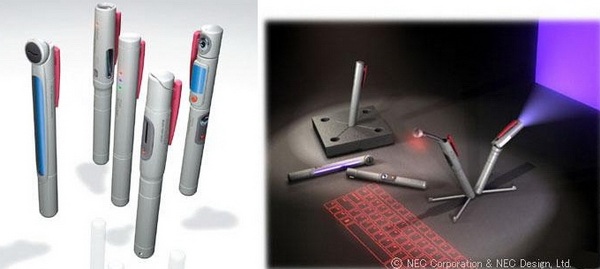 如果这款产品真的出现,那么它可能会是最便携的的电脑了。NEC纳须弥于芥子,将所有的硬件都容纳于两支笔中间。同第三款PC一样,也是一个负责显示一个负责输入。用投影来做键盘,这类产品已经出现,投影显示也不是太大的问题,唯一需要考虑的,就是如何把基础硬件都藏到小小的笔杆中了。