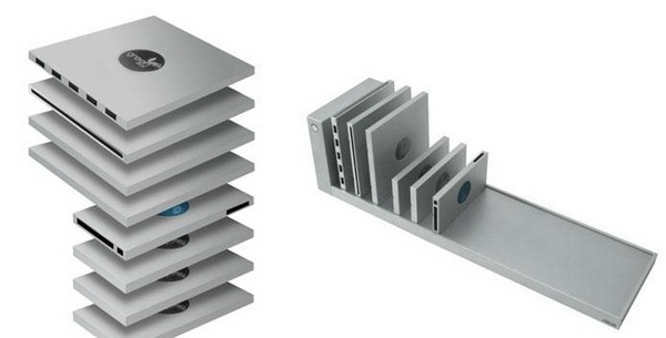 华硕的这台概念PC最大的亮点就是“模块化”,它将硬盘、光驱、内存、处理器、显卡、网络和USB适配器等都设计成一个一个小方盒子一样的模块,各模块之间使用智能的连接技术并采用非接触式电源进行供电。用户可以按照需要将所需要的模块装配起来,不过,它看上去跟现在PC没有太大的相似之处。
