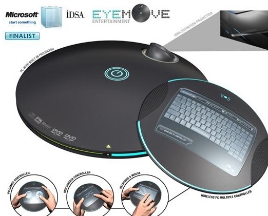 这也是一款概念PC,它由两个圆饼状配件组成,其一负责主机和投影显示,另一则相当于键盘等输入设备。为了实现多媒体功能,它还配置了DVD光驱,各种功能都很全面。