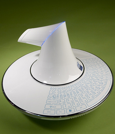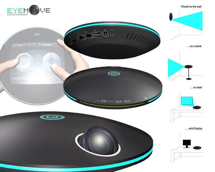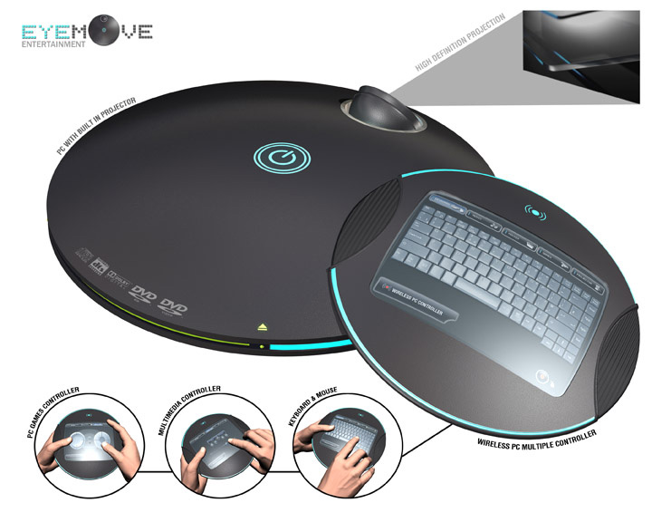 这款由Ricardo Baiao设计师设计的便携式笔记本,采用圆盘形的外观设计,主要由投影部分与虚拟键盘部分组成(分别为两个圆盘)。通过无线技术,虚拟键盘部分可进行操作。虚拟键盘部分同时也是一块显示屏,可以在上面进行触摸式操作。其中一块圆盘内置了DVD刻录光驱,碟片放置进取后同样可通过投影机进行墙上投影观看。