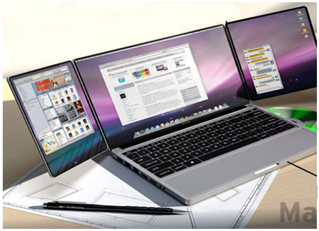 这款tribook应了它的名字,它有三个显示屏。其中一个是正常笔记本电脑显示屏的大小,另外两个在不用时可折叠,以减少空间。