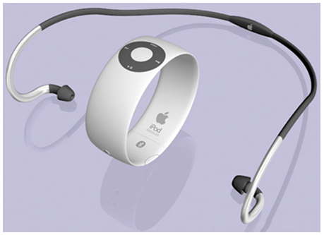 iPod Shuffle的概念是变成一个腕带的形象,并且可以在跑步时带着。这是一个手镯样式,将MP3与无线耳机相结合。非常适合女生使用。