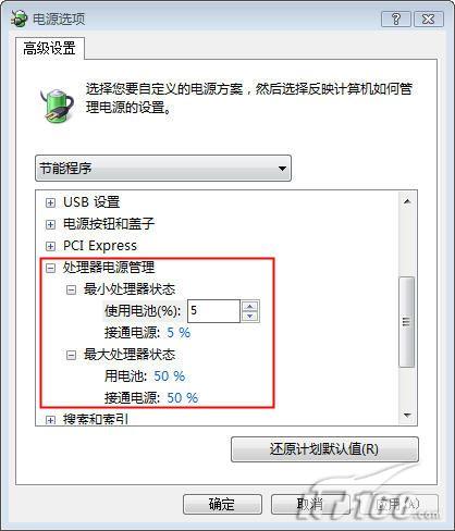 这是一个内置在Windows Vista中的新特性。你可以设置你的笔记本电脑CPU的最大和最小的性能。通过将最大性能的百分比减至你可承受的范围,你就能够降低它所要求的电量。CPU运行得越快,它所消耗的电池电量就越多。因此,如果你在使用的是字处理程序、电子邮件或任何只需要少量处理能力的应用程序,那么请将最大性能级别就如同你在汽车中放松油门一样——这样就能够保证你不会突然地消耗过多的汽油。