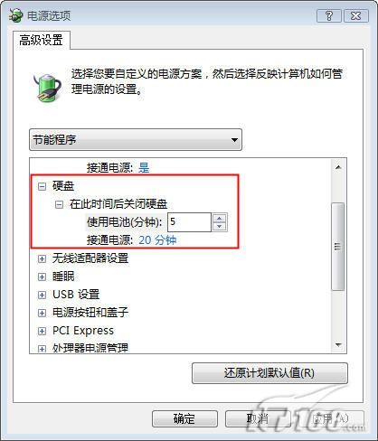 接下来,点击“更改高级电源设置”。当新的“高级设置”窗口出现时,在列表中找到“硬盘”。双击后再双击“在此时间后关闭硬盘”。此时,会出现一个“设置”选项,你可以看到一个“用电池”钟的时间。将其降至5分钟,这样就能够让你的硬盘在处于非活动状态时5分钟后关闭硬盘。