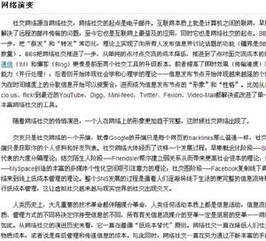 社交网络源自网络社交,网络社交的起点是电子邮件。互联网本质上就是计算机之间的联网,早期的E-mail解决了远程的邮件传输的问题,至今它也是互联网上最普及的应用,同时它也是网络社交的起点。BBS则更进了一步,把“群发”和“转发”常态化,理论上实现了向所有人发布信息并讨论话题的功能(疆界是BBS的访问者数量)。BBS把网络社交推进了一步,从单纯的点对点交流的成本降低,推进到了点对面交流成本的降低。即时通信(IM)和博客(Blog)更像是前面两个社交工具的升级版本,前者提高了即时效果(传输速度)和同时交流能力(并行处理);后者则开始体现社会学和心理学的理论——信息发布节点开始体现越来越强的个体意识,因为在时间维度上的分散信息开始可以被聚合,进而成为信息发布节点的“形象”和“性格”。比如从RSS、flickr到最近的YouTube、Digg、Mini-feed、Twitter、Fexion、Video-Mail都解决或改进了单一功能,是丰富网络社交的工具。 随着网络社交的悄悄演进,一个人在网络上的形象更加趋于完整,这时候社交网络出现了。 交友只是社交网络的一个开端,就像Google的开端只是每个网页的backlinks那么普通一样,社交网络的开端只是获取你的个人资料和好友列表。社交网络大体经历了这样一个发展过程:早期概念化阶段──SixDegrees代表的六度分隔理论;结交陌生人阶段──Friendster帮你建立弱关系从而带来更高社会资本的理论;娱乐化阶段──MySpace创造的丰富的多媒体个性化空间吸引注意力的理论;社交图阶段──Facebook复制线下真实人际网络来到线上低成本管理的理论。整个SNS发展的过程是循着人们逐渐将线下生活的更完整的信息流转移到线上进行低成本管理,这让虚拟社交越来越 与现实世界的社交出现交叉。 人类历史上,大凡重要的技术革命都伴随媒介革命,人类任何活动本质上都是信息活动,信息流的传递介质、管理方式的不同将决定你接受信息的不同,所有有关信息流媒介的变革一定是底层的变革——网络社交也是如此。从网络社交的演进历史来看,它一直在遵循“低成本替代”原则。网络社交一直在降低人们社交的时间和物质成本,或者说是降低管理和传递信息的成本。与此同时,网络社交一直在努力通过不断丰富的手段和工具,来替代传统社交来满足人类这种社会性动物的交流需求,并且正在按照从“增量性的娱乐”到“常量性的生活”这条轨迹不断接近基本需求。 如果说在网络社交的起点——电子邮件时代,网络仅仅可以满足人们5%的社交需求,那么今天丰富的社交网络已经可以把这个数字至少提升了10倍,除了“接触型”的社交行为,或者说是“接触型”信息的收集和发布之外,网络社交已经开始承担大部分传统社交的作用。实际上,“非接触型”的社交原本就占据了人类社交的80%以上,这意味着网络社交对传统世界必然会带来巨大的影响。 说到底,网络社交不仅仅是一些新潮的商业模式,从历史维度来看,它更是一个推动互联网向现实世界无限靠近的关键力量。目前,社交网络涵盖以人类社交为核心的所有网络服务形式,互联网是一个能够相互交流,相互沟通,相互参与的互动平台,互联网的发展早已超越了当初ARPANET的军事和技术目的,社交网络使得互联网从研究部门、学校、政府、商业应用平台扩展成一个人类社会交流的工具。现在网络社交更是把其范围拓展到移动手机平台领域,借助手机的普遍性和无线网络的应用,利用各种交友/即时通讯/邮件收发器等软件,使手机成为新的社交网络的载体。 社交网络,也就是网络+社交的意思。通过网络这一载体把人们连接起来,从而形成具有某一特点的团体。产品