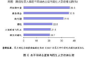 在失去“熟人框架下”城市里,很多人连邻居都没有交往,但与现实社交中的羞涩、障碍和顾忌形成对比的是:中国网民络社交带有明显的主动性。在调查中,主动找陌生人聊天的比例明显高于其它场合,如商业酒会、旅行团和参加朋友婚礼等。而在腾讯QQ的用户中,陌生网友占到了34%左右,比例远远超过家人(16%)、同事(26%)和其他朋友(24%)。