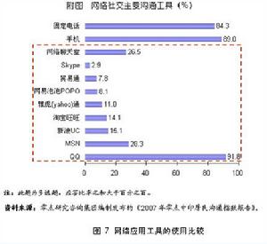 网络进入百姓家庭已有十多年时间了,随着其服务的完善功能的增强,人们对其的依赖程度日益加大(如图7)。以聊天软件QQ为例,其使用比例高达91.8%,甚至已经超过了手机(89%)和固定电话(84.3%)。此外,还有数量客观的各类专业交友网站(如图8)