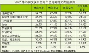 不同交友类型的用户在选择网络交友目的差异较大,以婚恋和休闲交友为目的的用户使用网络交友首要目的都是选择范围广,分别占59.3%和47.6%。而以商务交友为目的用户使用网络交友的首要目的则是工作需要,占63.4%。值得注意的是,这些数据随着时间变化的很明显。