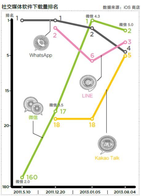 但移动聊天应用的日益流行正在改变这一局面。根据AnalysysMason的数据,有超过半数的智能手机用户是移动聊天应用的活跃用户,其中收发的社交信息数量已超过传统的短信。能搭上这波势头的是数十家提供移动信息APP的企业。line、whatsapp、微信已成为全球最受欢迎的APP。