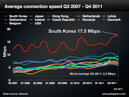 截至2006年,韩国96%的手机用户开通上网服务。现在,韩国的上网速度达到17.5 Mbps,位居世界第一。紧随其后的是日本,速度为9.1 Mbps,而后是香港、荷兰和拉脱维亚。美国排在第13位,速度为5.8 Mbps。美国网速最快的城市是波士顿,速度为8.4 Mbps。全球平均网速为2.3 Mbps,较2011年下降14%。