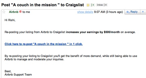 用户在Airbnb发布信息,随后会收到一封电子邮件,内容是告知用户:将该信息同时发布到Craigslist可以帮助每月增加高达约500美元的收入,您只需要点击这个链接,我们就可以为您完成。