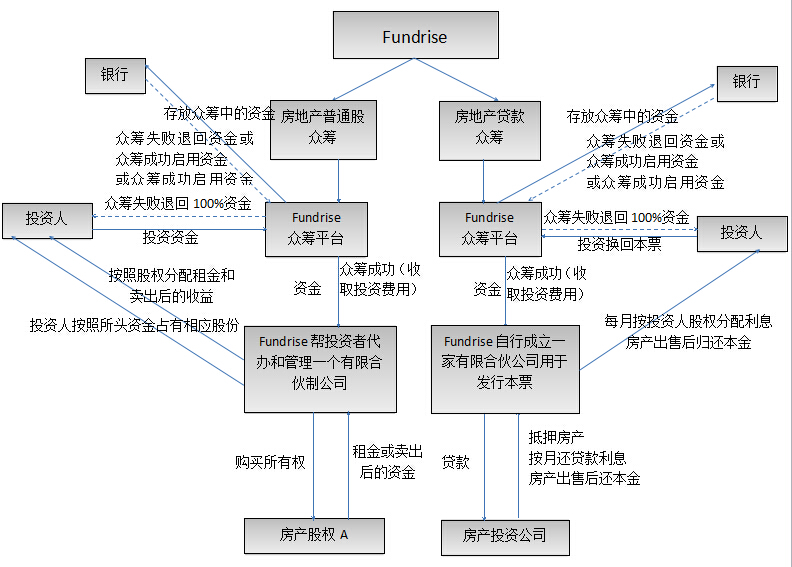 Fundrise是人人网投资的一家美国房地产众筹公司。与以上两家房地产众筹平台不同,Fundrise有四种众筹产品:1)房地产夹层债权众筹;2)房地产优先股众筹;3)房地产优先债众筹;4)房地产普通股众筹,而且Fundrise也在为修建中的房产进行债权众筹。所有的Fundrise的众筹产品都是通过组建有限合伙公司进行运作的。下图是Fundrise众筹产品简易流程图(将房地产夹层债权众筹、优先股众筹与优先债众筹归为贷款众筹大类):
