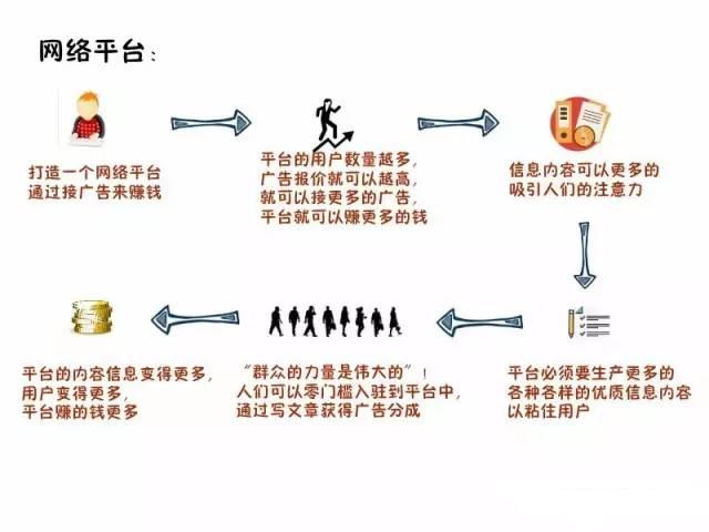 自媒体平台其实就是内容平台。通过内容来吸引用户,黏住用户,这样才能够吸引广告商,从而盈利。这个原理,天朝学子博客之前分享的文章中讲过,大致的思路就是下面这个图片: